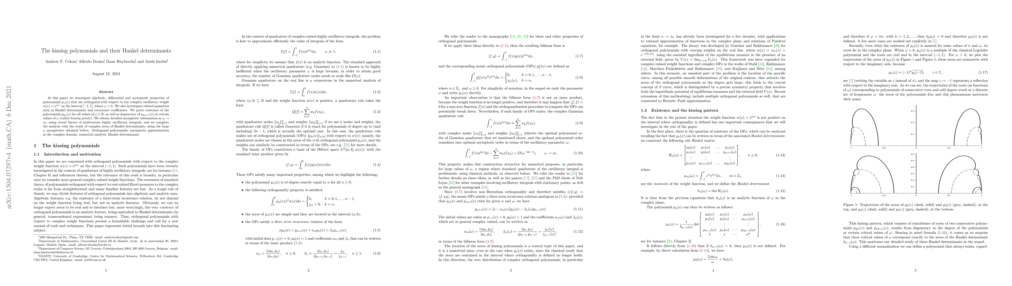 In this paper we investigate algebraic, differential and asymptotic properties of polynomials $p_n(x)$ that are orthogonal with respect to the complex oscillatory weight $w(x)=e^{i\omega x}$ on the interval $[-1,1]$, where $\omega>0$. We also investigate related quantities such as Hankel determinants and recurrence coefficients. We prove existence of the polynomials $p_{2n}(x)$ for all values of $\omega>0$, as well as degeneracy of $p_{2n+1}(x)$ at certain values of $\omega$ (called kissing points). We obtain detailed asymptotic information as $\omega\to\infty$, using recent theory of multivariate highly oscillatory integrals, and we complete the analysis with the study of complex zeros of Hankel determinants, using the large $\omega$ asymptotics obtained before.