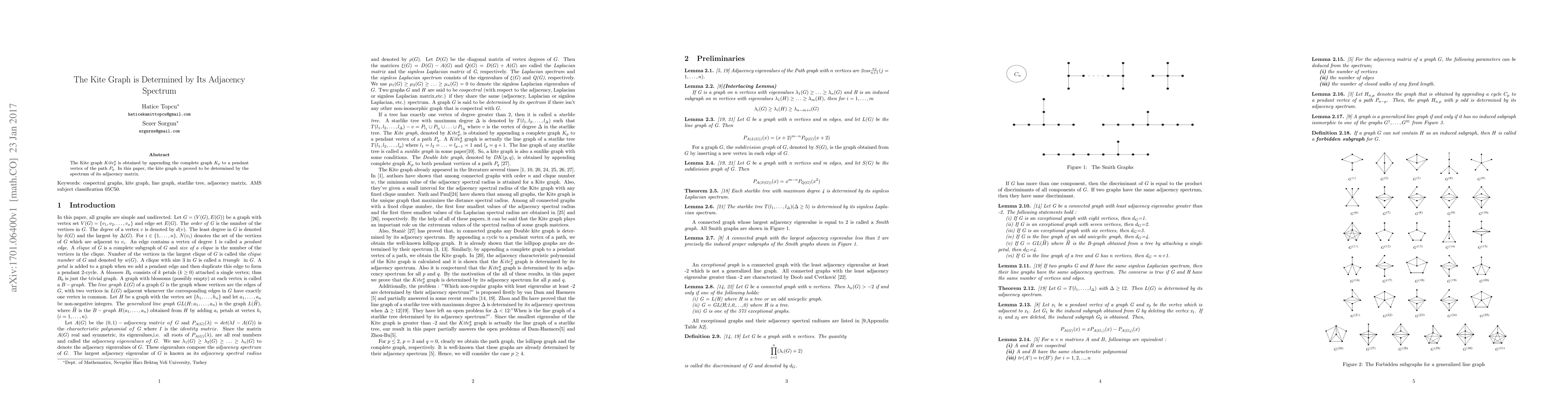 Summary: The paper demonstrates that the Kite graph $Kite_{p}^{q}$ is uniquely identified by its adjacency spectrum, showing that no other graph shares the same spectrum as the kite graph formed by appending a $K_{p}$ to a pendant vertex of a $P_{q}$ path.
