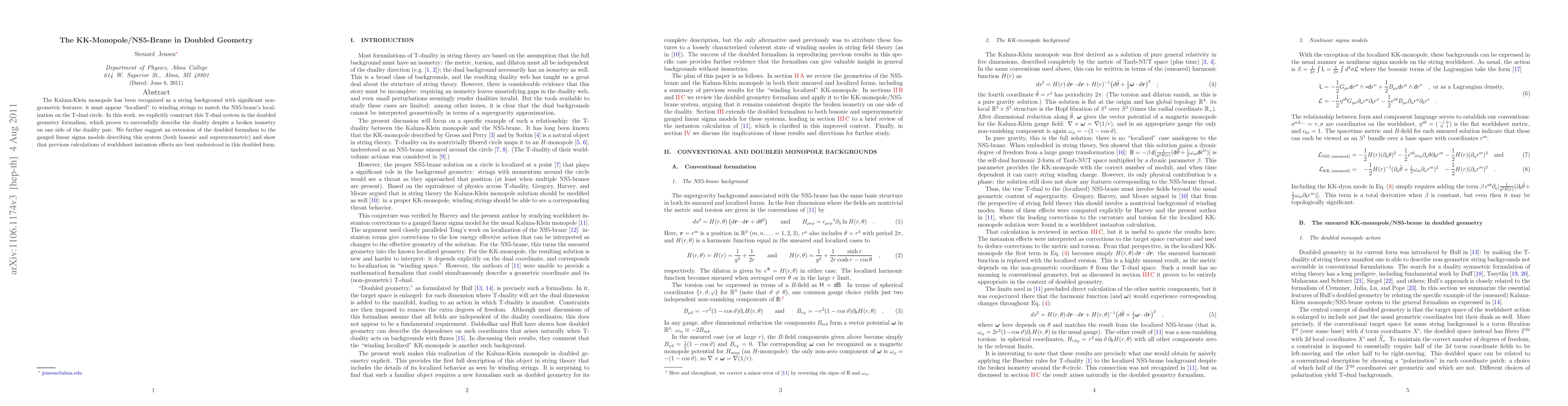The Kaluza-Klein monopole has been recognized as a string background with significant non-geometric features: it must appear "localized" to winding strings to match the NS5-brane's localization on the T-dual circle. In this work, we explicitly construct this T-dual system in the doubled geometry formalism, which proves to successfully describe the duality despite a broken isometry on one side of the duality pair. We further suggest an extension of the doubled formalism to the gauged linear sigma models describing this system (both bosonic and supersymmetric) and show that previous calculations of worldsheet instanton effects are best understood in this doubled form.