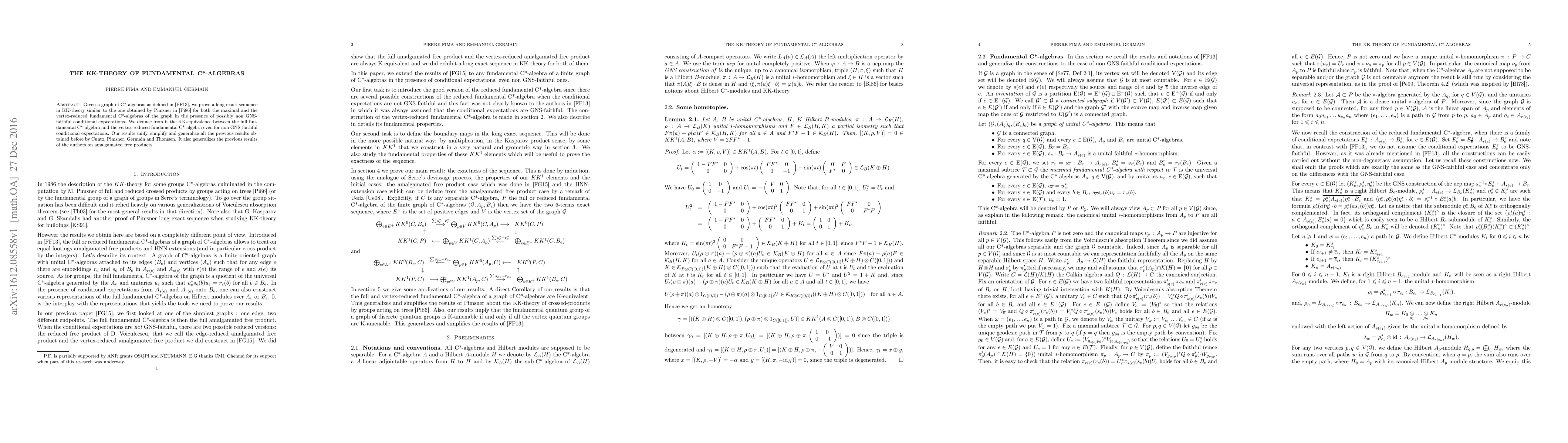 Given a graph of C*-algebras, we prove a long exact sequence in KK-theory for both the maximal and the vertex-reduced fundamental C*-algebras in the presence of possibly non GNS-faithful conditional expectations. We deduce from it the KK-equivalence between the full fundamental C*-algebra and the vertex-reduced fundamental C*-algebra even for non GNS-faithful conditional expectations. Our results unify, simplify and generalize all the previous results obtained before by Cuntz, Pimsner, Germain and Thomsen. It also generalizes the previous results of the authors on amalgamated free products.