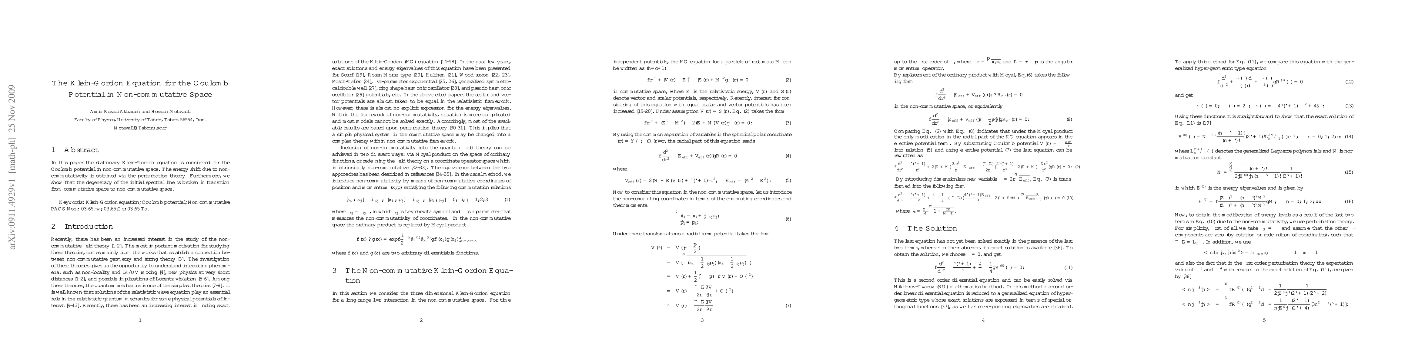 This paper investigates the stationary Klein-Gordon equation for the Coulomb potential in non-commutative space, deriving the energy shift due to non-commutativity through perturbation theory. It also demonstrates the breaking of degeneracy in the spectral line when transitioning from commutative to non-commutative space.