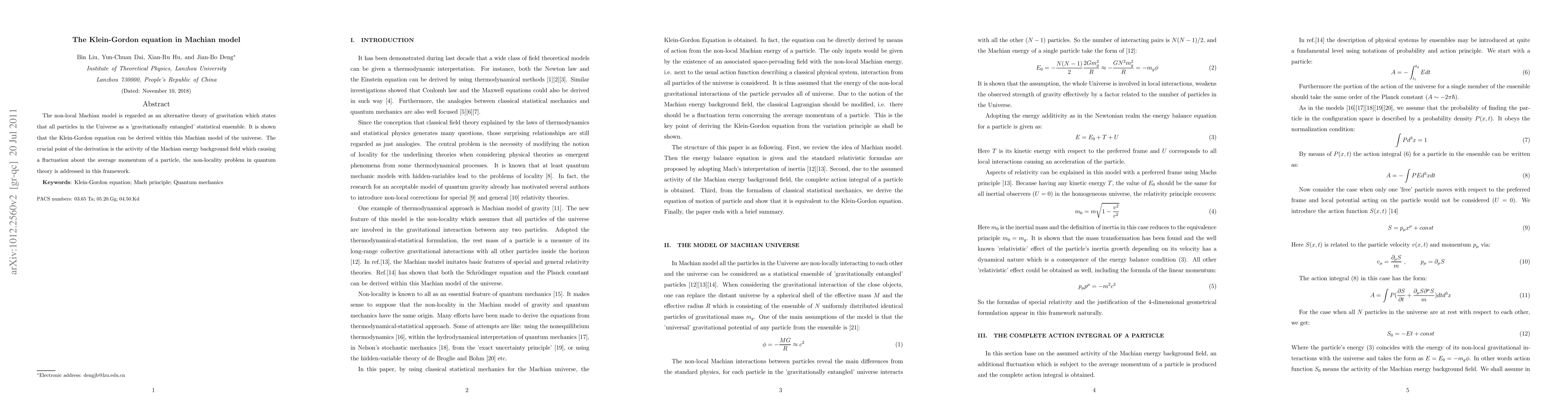 The paper presents a derivation of the Klein-Gordon equation from a Machian model, incorporating a non-local energy background field to address quantum non-locality.