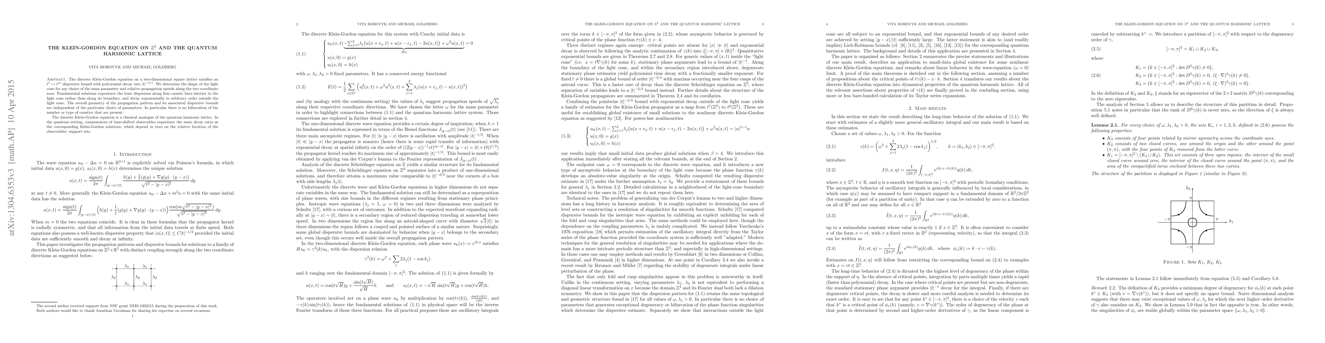 The discrete Klein-Gordon equation on a two-dimensional square lattice satisfies an $\ell^1 \mapsto \ell^\infty$ dispersive bound with polynomial decay rate $|t|^{-3/4}$. We determine the shape of the light cone for any choice of the mass parameter and relative propagation speeds along the two coordinate axes. Fundamental solutions experience the least dispersion along four caustic lines interior to the light cone rather than along its boundary, and decay exponentially to arbitrary order outside the light cone. The overall geometry of the propagation pattern and its associated dispersive bounds are independent of the particular choice of parameters. In particular there is no bifurcation of the number or type of caustics that are present. The discrete Klein-Gordon equation is a classical analogue of the quantum harmonic lattice. In the quantum setting, commutators of time-shifted observables experience the same decay rates as the corresponding Klein-Gordon solutions, which depend in turn on the relative location of the observables' support sets.