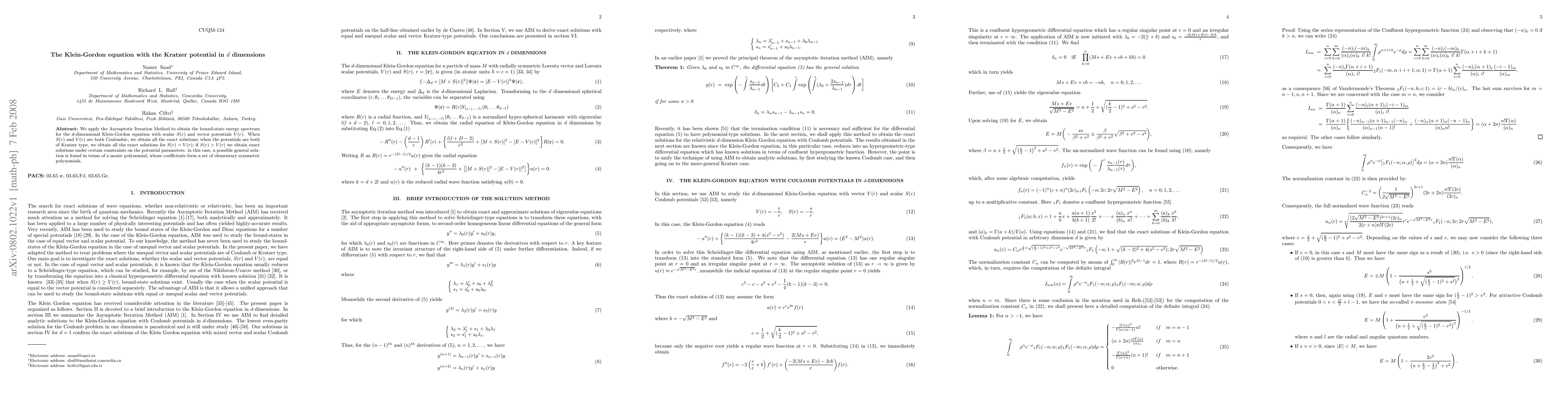 We apply the Asymptotic Iteration Method to obtain the bound-state energy spectrum for the d-dimensional Klein-Gordon equation with scalar S(r) and vector potentials V(r). When S(r) and V(r) are both Coulombic, we obtain all the exact solutions; when the potentials are both of Kratzer type, we obtain all the exact solutions for S(r)=V(r); if S(r) > V(r) we obtain exact solutions under certain constraints on the potential parameters: in this case, a possible general solution is found in terms of a monic polynomial, whose coefficients form a set of elementary symmetric polynomials.