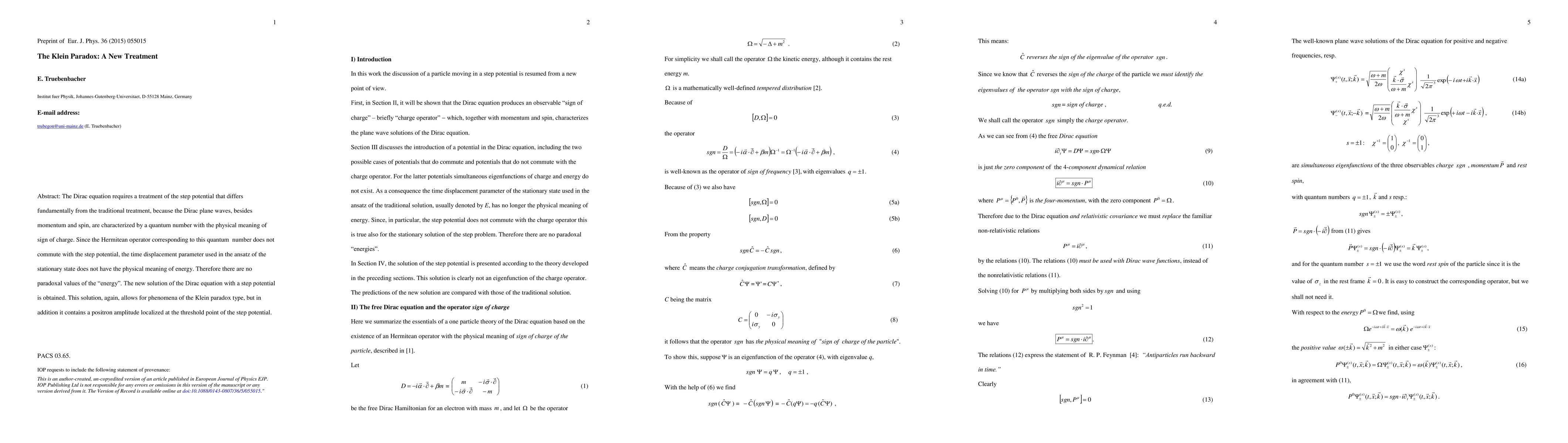 The paper proposes a new treatment for the Dirac equation's step potential, resolving the Klein paradox. It introduces a quantum number signifying charge, leading to a solution with a localized positron amplitude at the potential threshold, eliminating paradoxical energy values.