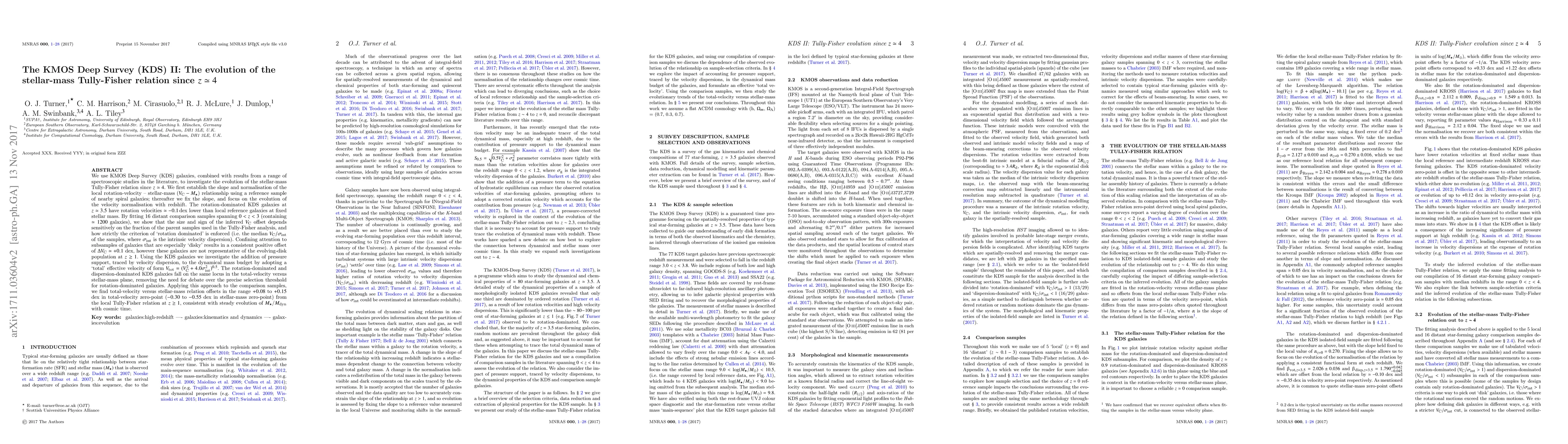 The KMOS Deep Survey (KDS) II investigates the evolution of the stellar-mass Tully-Fisher relation from z ~ 4 to the present. The study finds that galaxies at z ~ 3.5 have rotation velocities ~ -0.1 dex lower than local galaxies at fixed stellar mass, indicating a steady evolution in the ratio of dynamical to stellar mass over cosmic time.