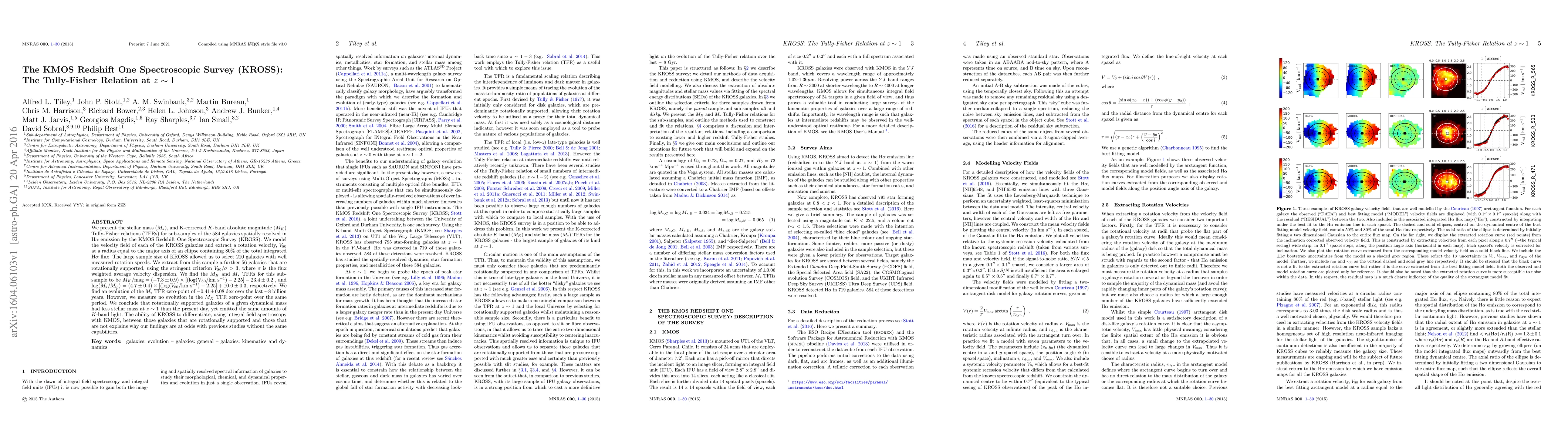 The KMOS Redshift One Spectroscopic Survey (KROSS) reveals a Tully-Fisher relation (TFR) for 56 rotationally supported galaxies at z ~ 1, showing less stellar mass but no change in K-band luminosity compared to present-day galaxies, highlighting the survey's ability to distinguish rotationally supported galaxies.