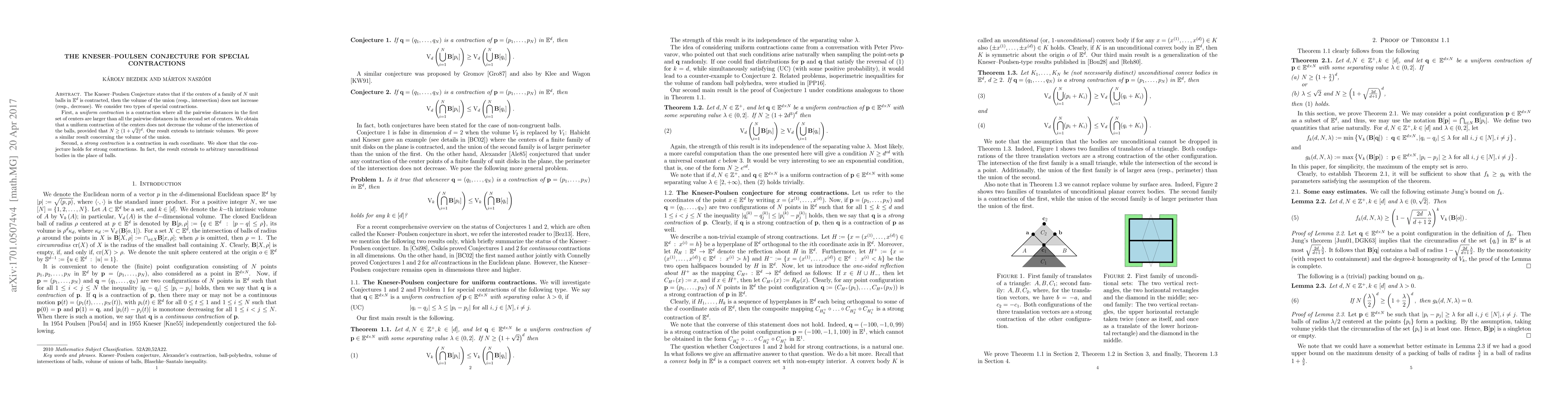 The Kneser--Poulsen Conjecture states that if the centers of a family of $N$ unit balls in ${\mathbb E}^d$ is contracted, then the volume of the union (resp., intersection) does not increase (resp., decrease). We consider two types of special contractions. First, a \emph{uniform contraction} is a contraction where all the pairwise distances in the first set of centers are larger than all the pairwise distances in the second set of centers. We obtain that a uniform contraction of the centers does not decrease the volume of the intersection of the balls, provided that $N\geq(1+\sqrt{2})^d$. Our result extends to intrinsic volumes. We prove a similar result concerning the volume of the union. Second, a \emph{strong contraction} is a contraction in each coordinate. We show that the conjecture holds for strong contractions. In fact, the result extends to arbitrary unconditional bodies in the place of balls.