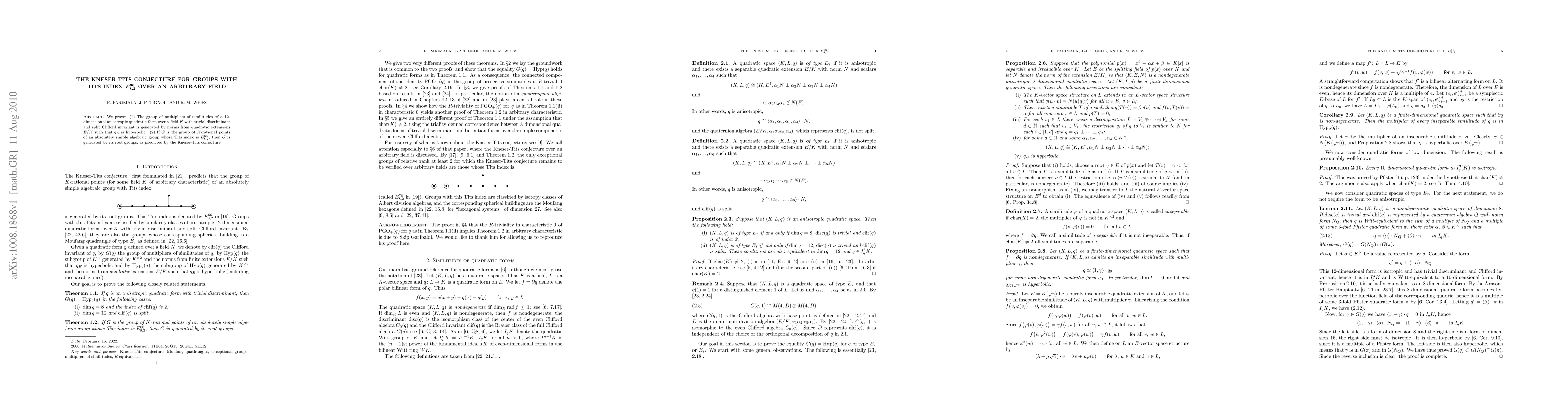 We prove: (1) The group of multipliers of similitudes of a 12-dimensional anisotropic quadratic form over a field K with trivial discriminant and split Clifford invariant is generated by norms from quadratic extensions E/K such that q_E is hyperbolic. (2) If G is the group of K-rational points of an absolutely simple algebraic group whose Tits index is E_{8,2}^{66}, then G is generated by its root groups, as predicted by the Kneser-Tits conjecture.