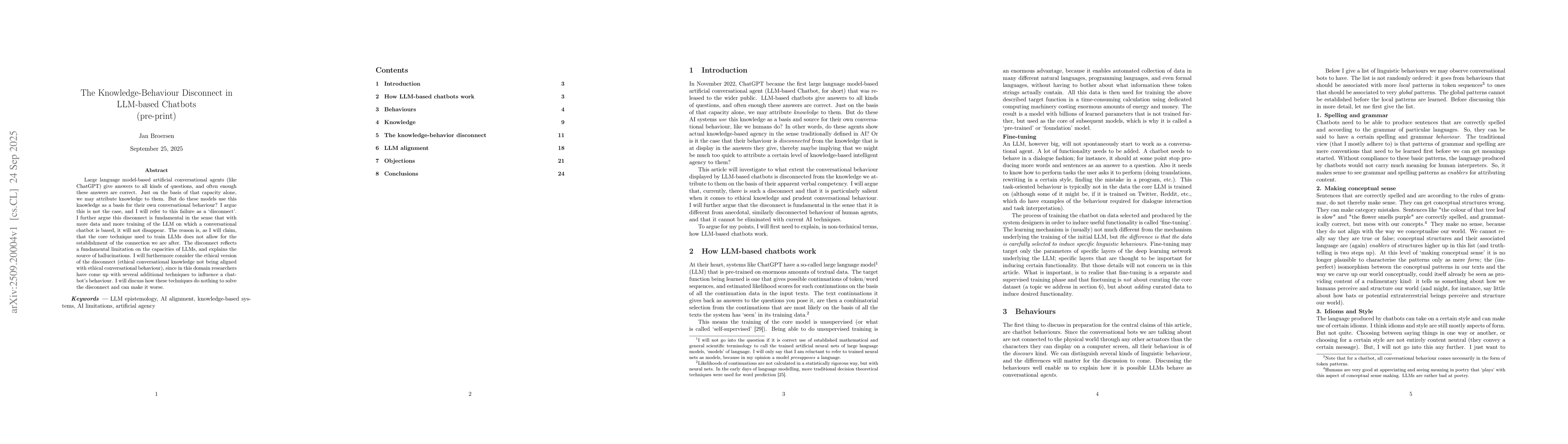 Large language model-based artificial conversational agents (like ChatGPT) give answers to all kinds of questions, and often enough these answers are correct. Just on the basis of that capacity alone, we may attribute knowledge to them. But do these models use this knowledge as a basis for their own conversational behaviour? I argue this is not the case, and I will refer to this failure as a `disconnect'. I further argue this disconnect is fundamental in the sense that with more data and more training of the LLM on which a conversational chatbot is based, it will not disappear. The reason is, as I will claim, that the core technique used to train LLMs does not allow for the establishment of the connection we are after. The disconnect reflects a fundamental limitation on the capacities of LLMs, and explains the source of hallucinations. I will furthermore consider the ethical version of the disconnect (ethical conversational knowledge not being aligned with ethical conversational behaviour), since in this domain researchers have come up with several additional techniques to influence a chatbot's behaviour. I will discuss how these techniques do nothing to solve the disconnect and can make it worse.