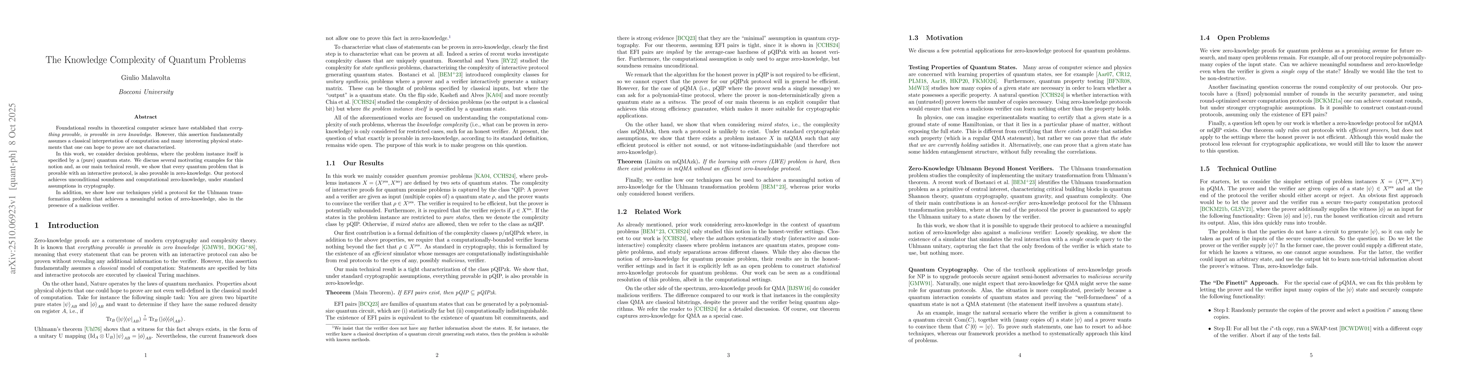 Foundational results in theoretical computer science have established that everything provable, is provable in zero knowledge. However, this assertion fundamentally assumes a classical interpretation of computation and many interesting physical statements that one can hope to prove are not characterized. In this work, we consider decision problems, where the problem instance itself is specified by a (pure) quantum state. We discuss several motivating examples for this notion and, as our main technical result, we show that every quantum problem that is provable with an interactive protocol, is also provable in zero-knowledge. Our protocol achieves unconditional soundness and computational zero-knowledge, under standard assumptions in cryptography. In addition, we show how our techniques yield a protocol for the Uhlmann transformation problem that achieves a meaningful notion of zero-knowledge, also in the presence of a malicious verifier.