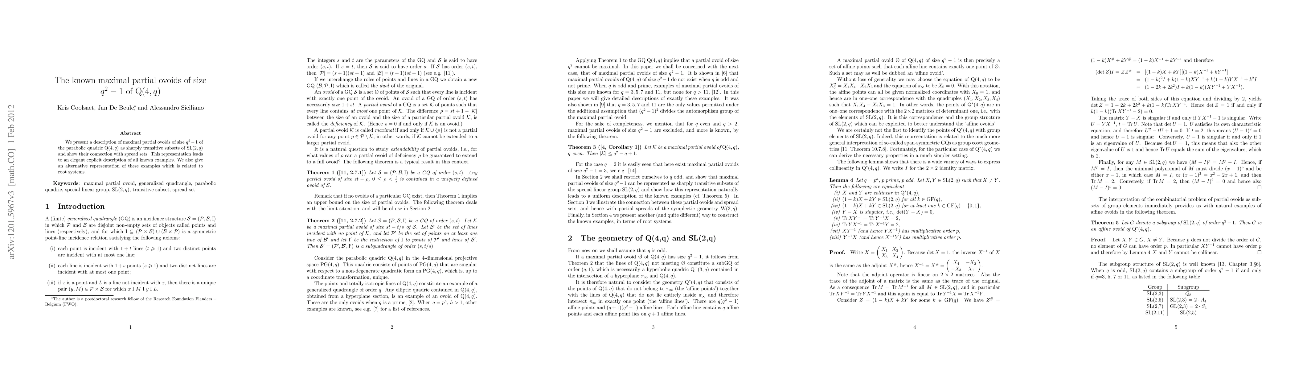 This paper describes maximal partial ovoids of size $q^2-1$ in the parabolic quadric $Q(4,q)$ as sharply transitive subsets of $\SL(2,q)$, linking them to spread sets and providing an elegant explicit representation. An alternative representation is also presented, connected to root systems.