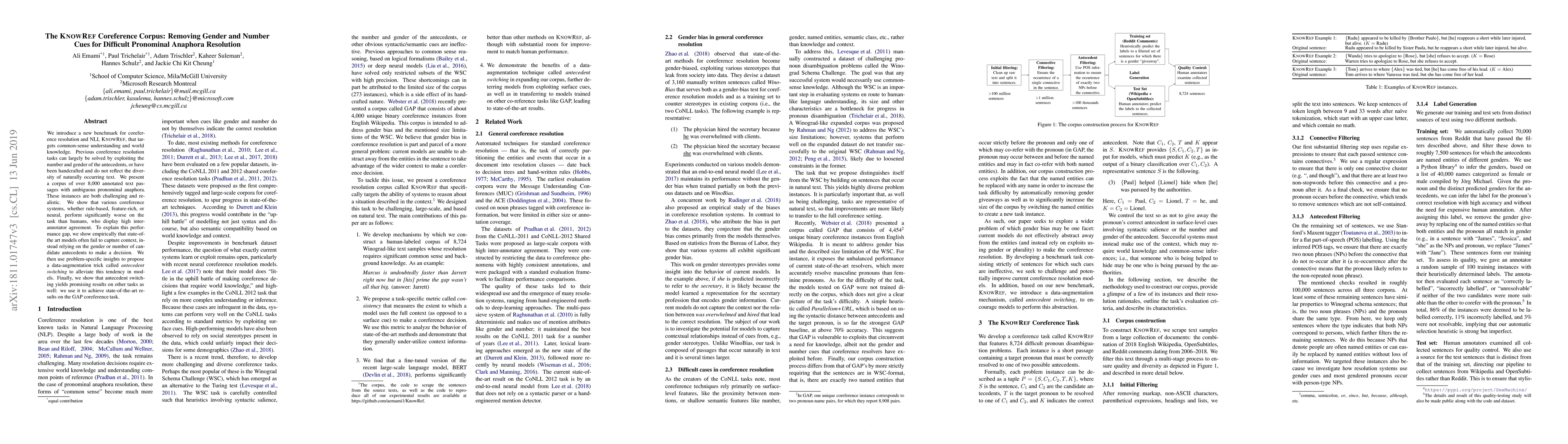 The Knowref Coreference Corpus aims to improve coreference resolution by removing gender and number cues, revealing that current models rely too heavily on these features instead of context. Antecedent switching, a proposed data-augmentation technique, shows promise in bridging the performance gap between models and human annotators.