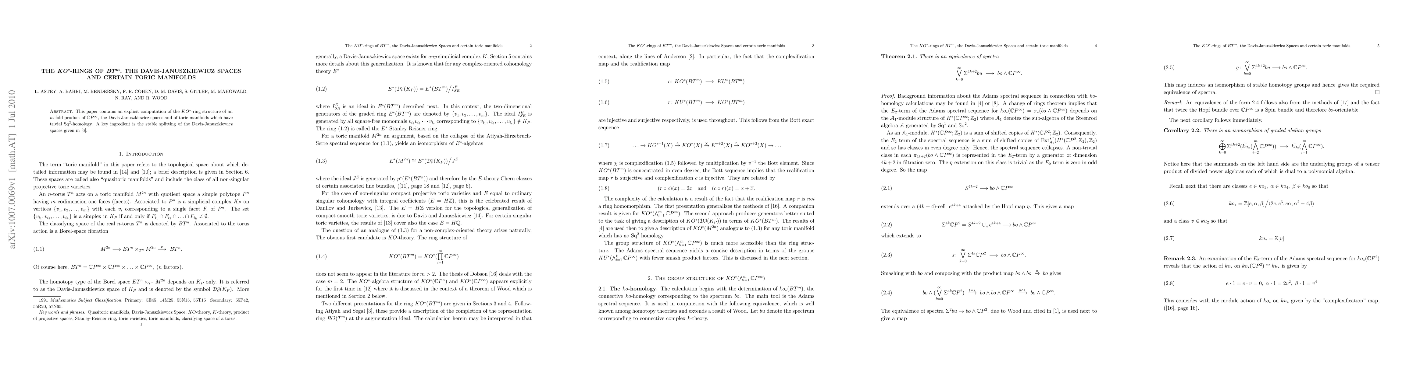 The paper provides an explicit computation of the KO*-ring structure for m-fold products of CP^{\infty}, Davis-Januszkiewicz spaces, and certain toric manifolds, focusing on those with trivial Sq^2-homology. The results contribute to the understanding of the topological properties of these spaces.