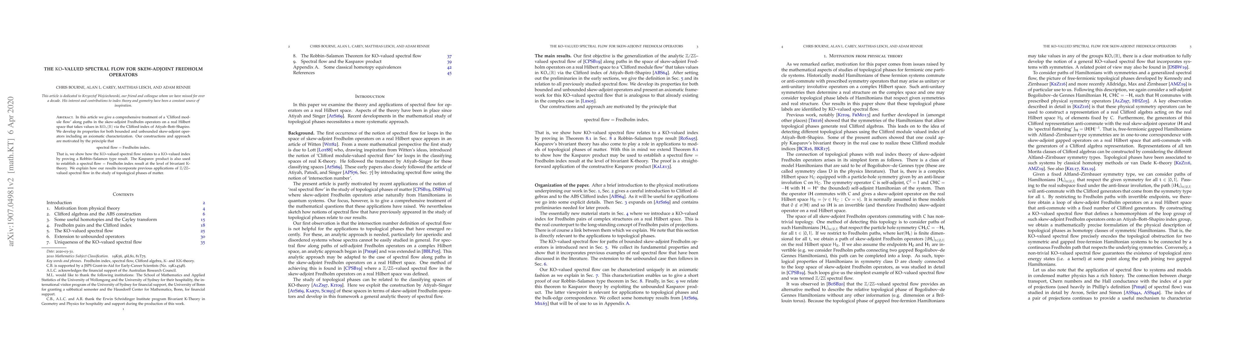 The paper introduces a KO-valued spectral flow for skew-adjoint Fredholm operators and establishes its properties and relationships with K-theory.
