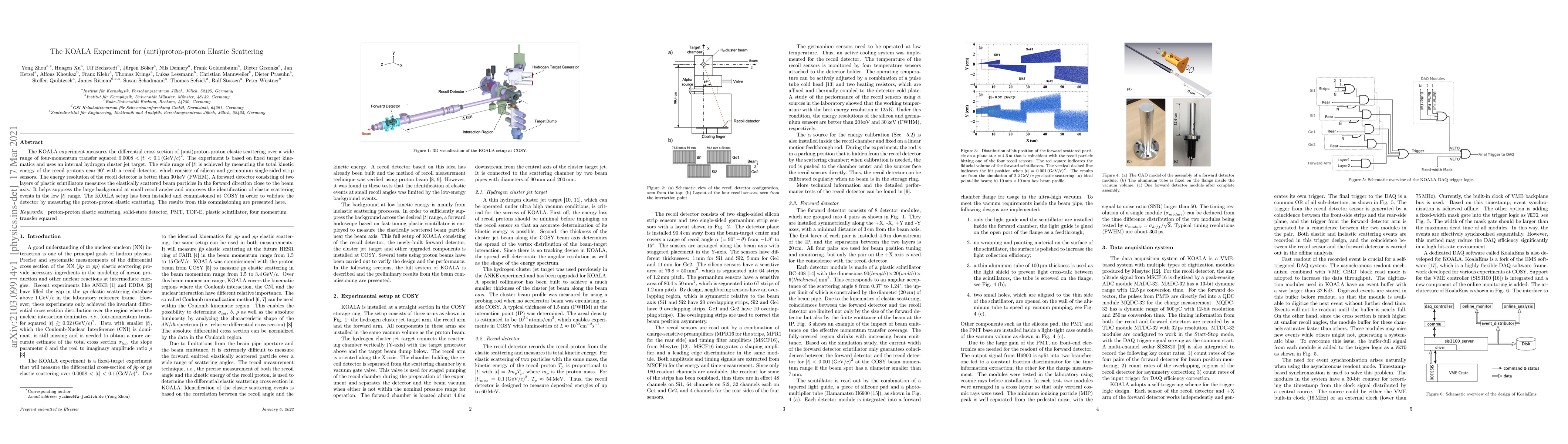 The KOALA experiment measures the differential cross section of (anti)proton-proton elastic scattering over a wide range of four-momentum transfer squared 0.0008 < |t| < 0.1 (GeV/c)$^2$ . The forward scattering parameters and the absolute luminosity can be deduced by analyzing the characteristic shape of the differential cross-section spectrum. The experiment is based on fixed target kinematics and uses an internal hydrogen cluster jet target. The wide range of |t| is achieved by measuring the total kinetic energy of the recoil protons near 90{\deg} with a recoil detector, which consists of silicon and germanium single-sided strip sensors. The energy resolution of the recoil detector is better than 30 keV (FWHM). A forward detector consisting of two layers of plastic scintillators measures the elastically scattered beam particles in the forward direction close to the beam axis. It helps suppress the large background at small recoil angles and improves the identification of elastic scattering events in the low |t| range. The KOALA setup has been installed and commissioned at COSY in order to validate the detector by measuring the proton-proton elastic scattering. The results from this commissioning are presented here.