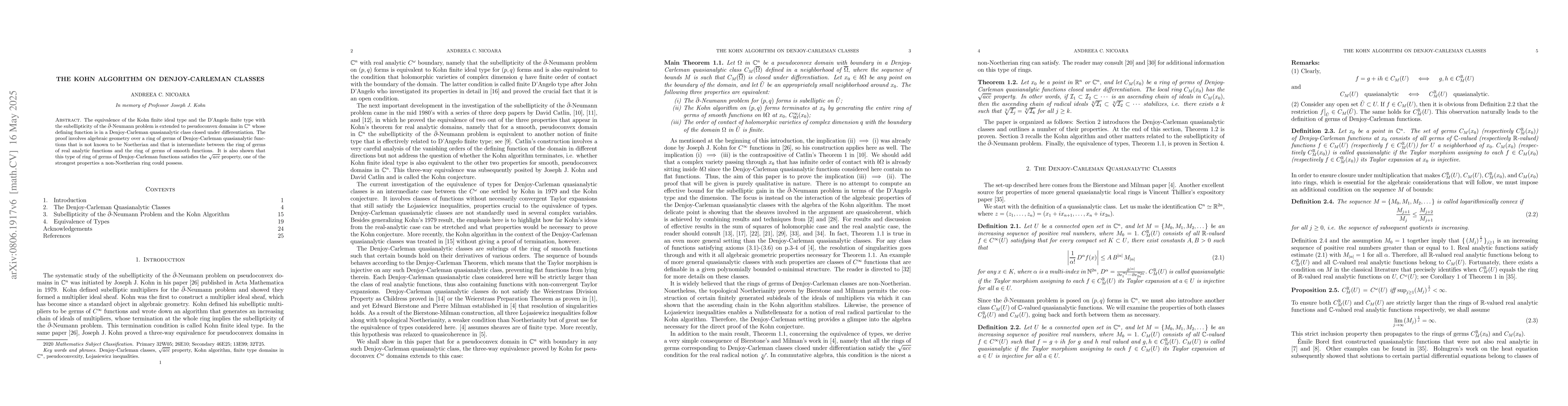 This paper extends the equivalence of Kohn finite ideal type and D'Angelo finite type to subellipticity of the $\bar\partial$-Neumann problem in pseudoconvex domains defined by Denjoy-Carleman quasianalytic functions. The proof leverages algebraic geometry over a non-Noetherian ring of Denjoy-Carleman quasianalytic germs, demonstrating its $\sqrt{acc}$ property.