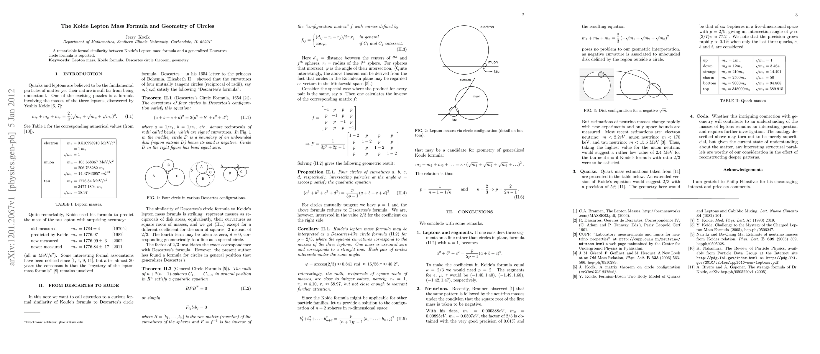A remarkable formal similarity between Koide's Lepton mass formula and a generalized Descartes circle formula is reported.