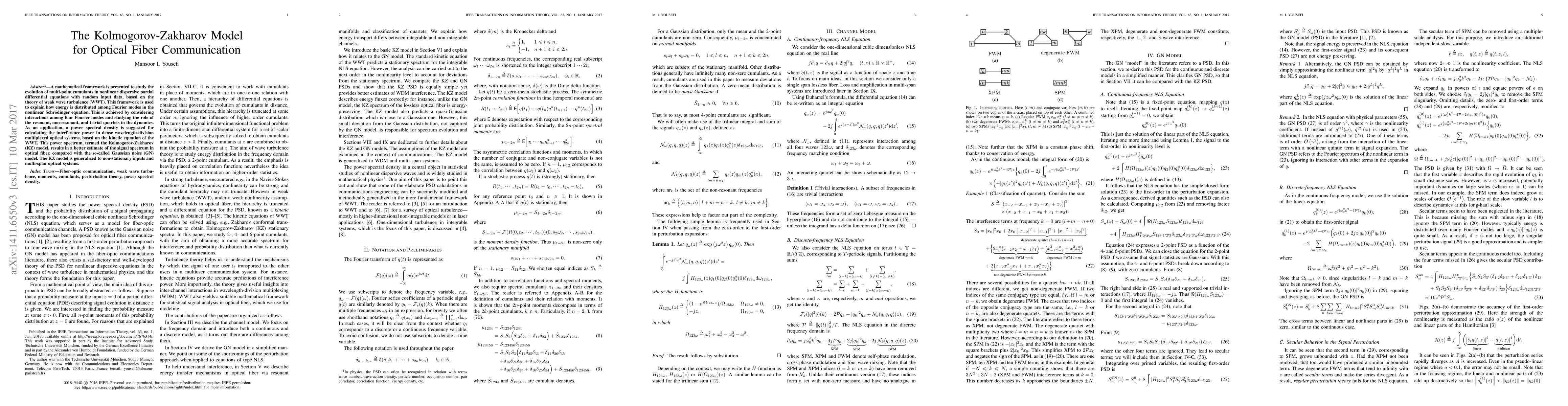 A mathematical framework is presented to study the evolution of multi-point cumulants in nonlinear dispersive partial differential equations with random input data, based on the theory of weak wave turbulence (WWT). This framework is used to explain how energy is distributed among Fourier modes in the nonlinear Schr\"odinger equation. This is achieved by considering interactions among four Fourier modes and studying the role of the resonant, non-resonant, and trivial quartets in the dynamics. As an application, a power spectral density is suggested for calculating the interference power in dense wavelength-division multiplexed optical systems, based on the kinetic equation of the WWT. This power spectrum, termed the Kolmogorov-Zakharov (KZ) model, results in a better estimate of the signal spectrum in optical fiber, compared with the so-called Gaussian noise (GN) model. The KZ model is generalized to non-stationary inputs and multi-span optical systems.