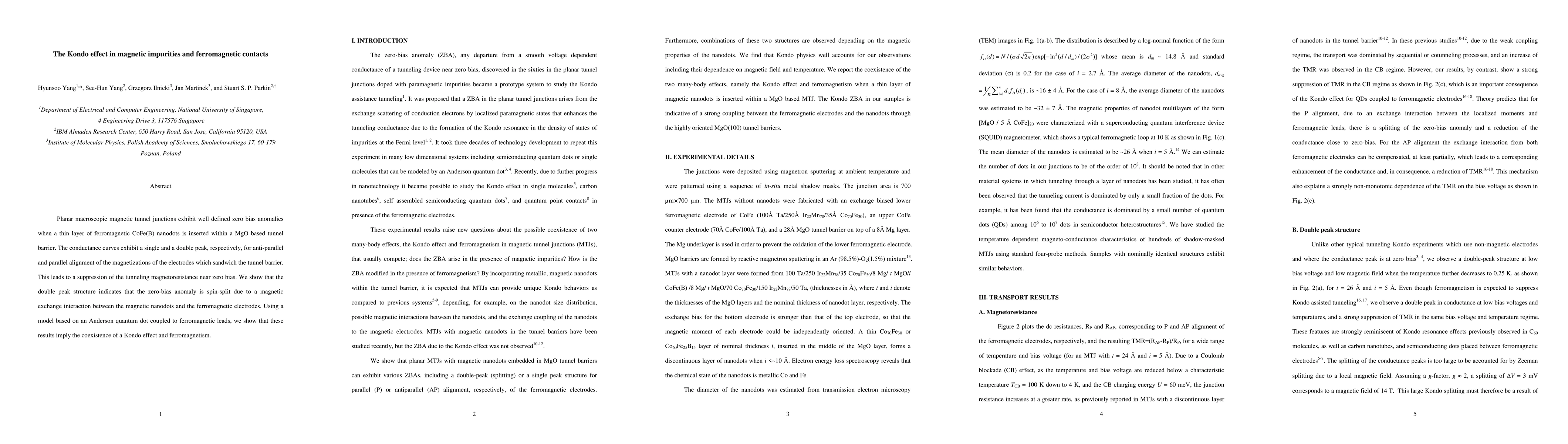 Planar macroscopic magnetic tunnel junctions exhibit well defined zero bias anomalies when a thin layer of ferromagnetic CoFe(B) nanodots is inserted within a MgO based tunnel barrier. The conductance curves exhibit a single and a double peak, respectively, for anti-parallel and parallel alignment of the magnetizations of the electrodes which sandwich the tunnel barrier. This leads to a suppression of the tunneling magnetoresistance near zero bias. We show that the double peak structure indicates that the zero-bias anomaly is spin-split due to a magnetic exchange interaction between the magnetic nanodots and the ferromagnetic electrodes. Using a model based on an Anderson quantum dot coupled to ferromagnetic leads, we show that these results imply the coexistence of a Kondo effect and ferromagnetism.