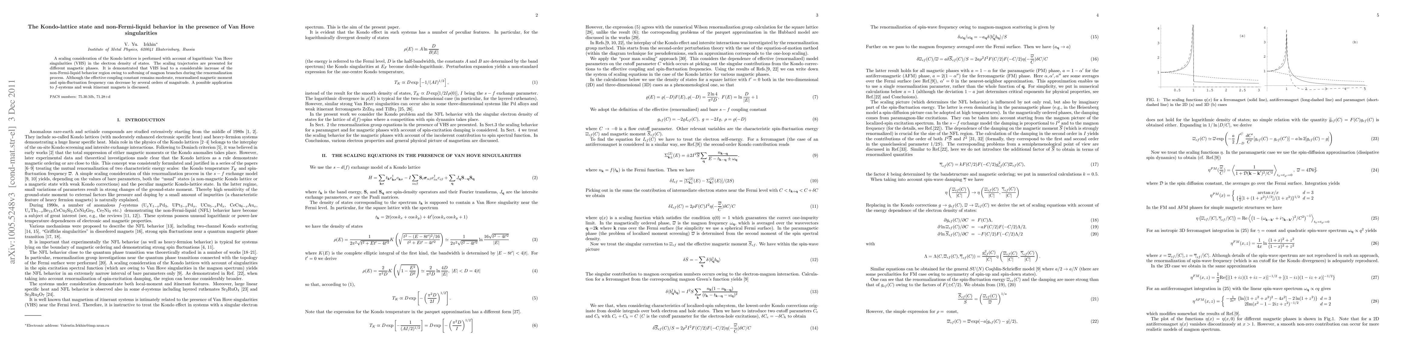 A scaling consideration of the Kondo lattices is performed with account of logarithmic Van Hove singularities (VHS) in the electron density of states. The scaling trajectories are presented for different magnetic phases. It is demonstrated that VHS lead to a considerable increase of the non-Fermi-liquid behavior region owing to softening of magnon branches during the renormalization process. Although the effective coupling constant remains moderate, renormalized magnetic moment and spin-fluctuation frequency can decrease by several orders of magnitude. A possible application to f-systems and weak itinerant magnets is discussed.