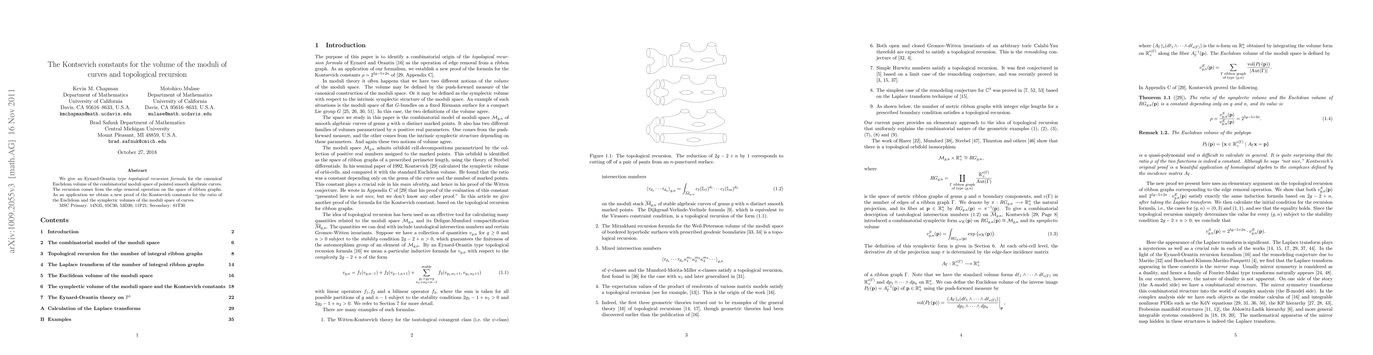 Summary: This paper introduces a topological recursion formula for the volume of the moduli space of pointed smooth algebraic curves, derived from edge removal on ribbon graphs, and uses it to provide a new proof for Kontsevich constants relating Euclidean and symplectic volumes of this space.