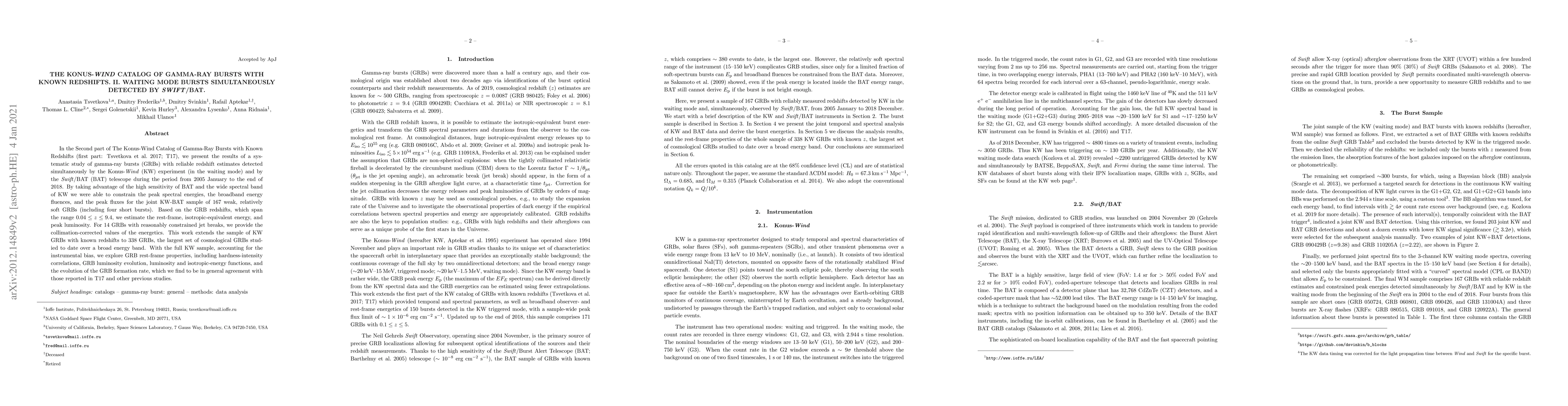 This research expands the Konus-Wind gamma-ray burst (GRB) catalog with known redshifts, focusing on 167 weak, soft GRBs simultaneously detected by Swift/BAT. By analyzing redshifts spanning 0.04 to 9.4, the study estimates rest-frame energetics and peak luminosities. It also provides collimation-corrected energetics for 14 GRBs with jet break constraints. The expanded catalog, now at 338 GRBs, allows exploration of GRB properties, supporting previous findings on hardness-intensity correlations, luminosity evolution, and formation rate.