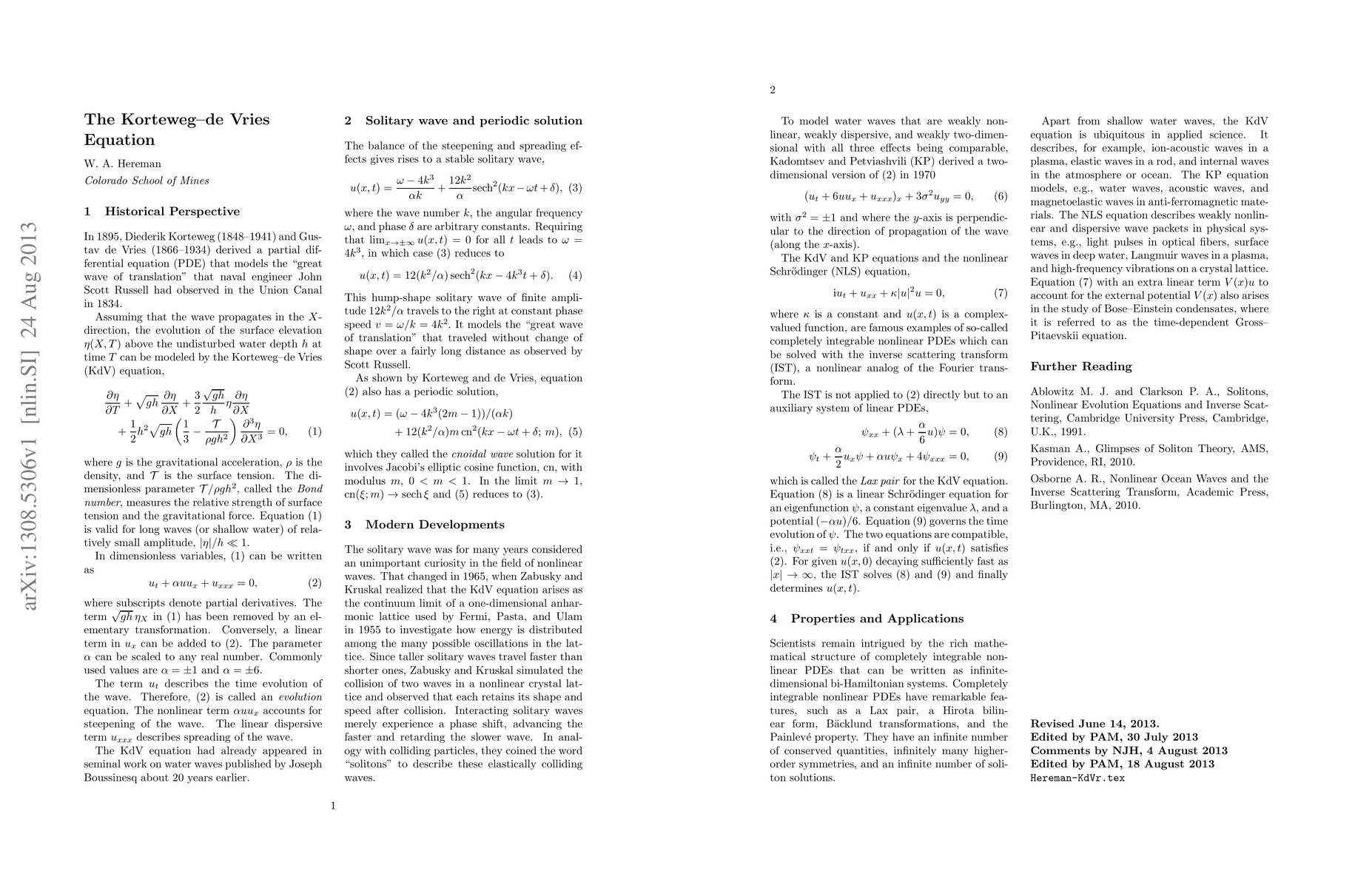 Two page encyclopedic article about the Korteweg-de Vries equation covering historical perspective, solitary wave and periodic solutions, modern developments, properties and applications, and further reading.