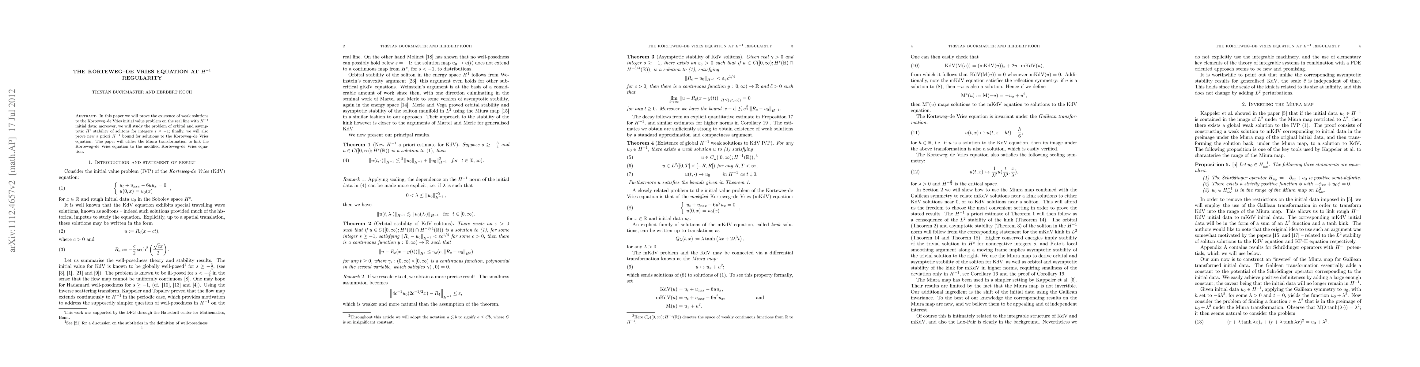 This paper proves the existence of weak solutions to the Korteweg-de Vries equation with H^{-1} initial data and investigates the orbital and asymptotic H^{s} stability of solitons. It also establishes new a priori H^{-1} bounds for solutions, utilizing the Miura transformation to link the equation to the modified Korteweg-de Vries equation.