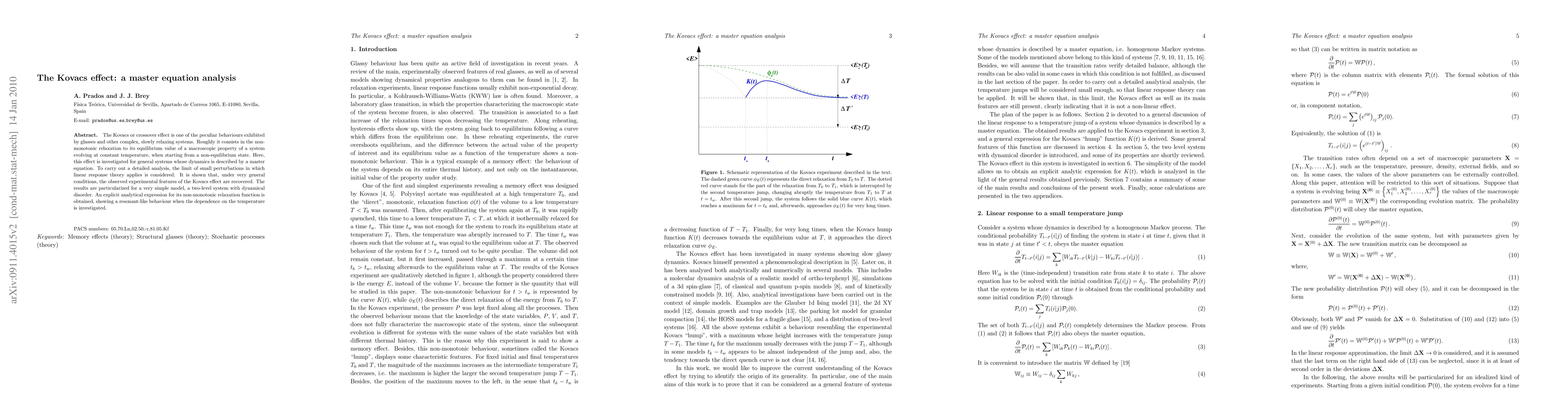 This research paper investigates the Kovacs effect, a peculiar non-monotonic relaxation behavior in complex systems, using a master equation approach. It demonstrates, through linear response theory in the small perturbation limit, that general systems exhibiting this effect can be explained under general conditions. The findings are illustrated with a simple two-level system model, revealing a resonant-like temperature dependence.