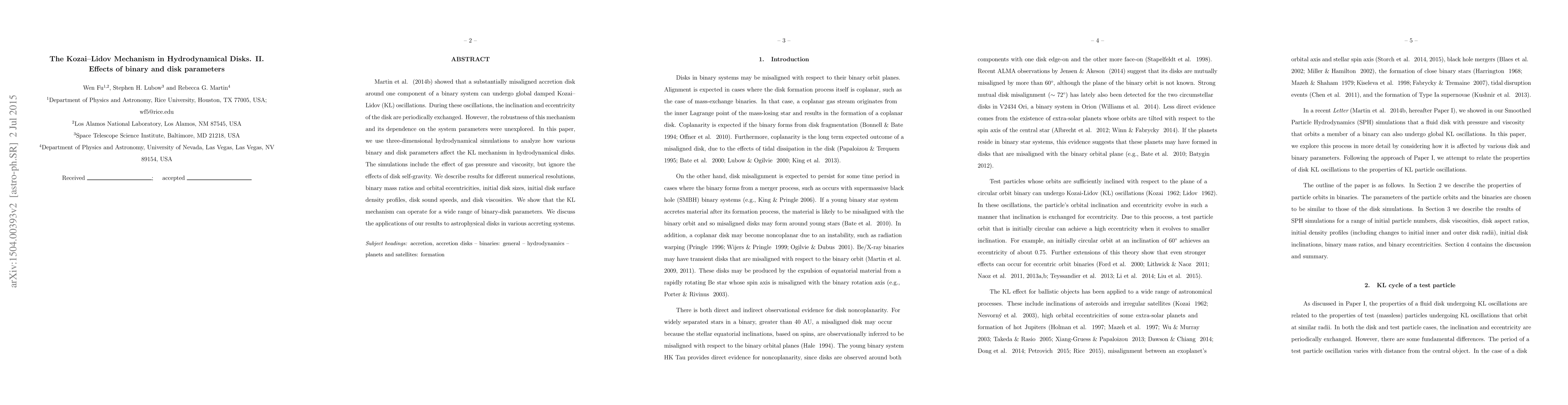 Martin et al. (2014b) showed that a substantially misaligned accretion disk around one component of a binary system can undergo global damped Kozai-Lidov oscillations. During these oscillations, the inclination and eccentricity of the disk are periodically exchanged. However, the robustness of this mechanism and its dependence on the system parameters were unexplored. In this paper, we use three-dimensional hydrodynamical simulations to analyze how various binary and disk parameters affect the Kozai-Lidov mechanism in hydrodynamical disks. The simulations include the effect of gas pressure and viscosity, but ignore the effects of disk self-gravity. We describe results for different numerical resolutions, binary mass ratios and orbital eccentricities, initial disk sizes, initial disk surface density profiles, disk sound speeds, and disk viscosities. We show that the Kozai-Lidov mechanism can operate for a wide range of binary-disk parameters. We discuss the applications of our results to astrophysical disks in various accreting systems.