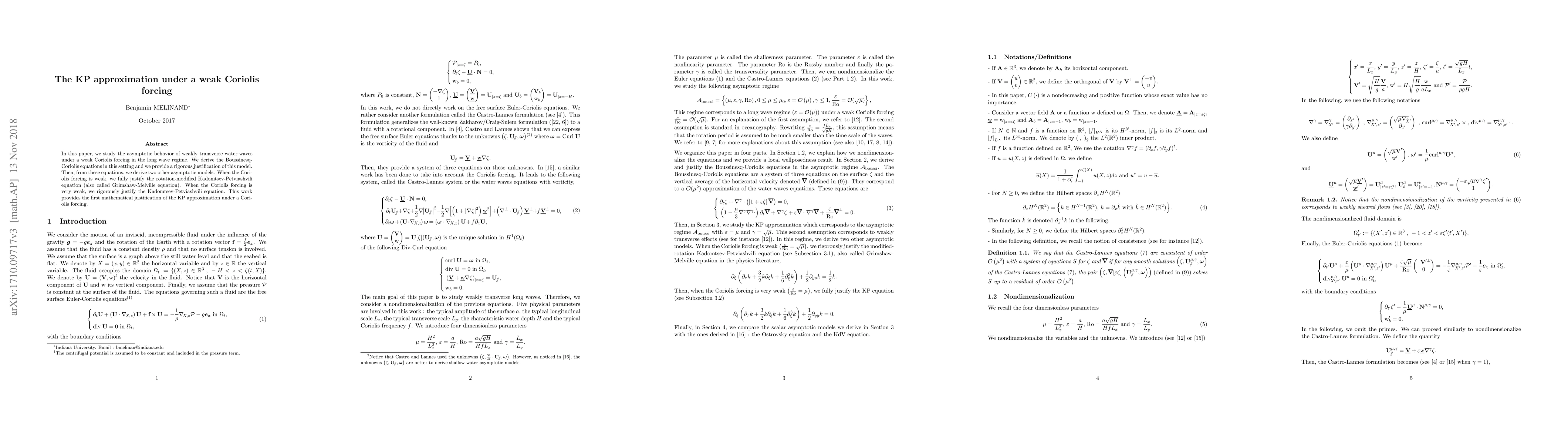 In this paper, we study the asymptotic behavior of weakly transverse water-waves under a weak Coriolis forcing in the long wave regime. We derive the Boussinesq-Coriolis equations in this setting and we provide a rigorous justification of this model. Then, from these equations, we derive two other asymptotic models. When the Coriolis forcing is weak, we fully justify the rotation-modified Kadomtsev-Petviashvili equation (also called Grimshaw-Melville equation). When the Coriolis forcing is very weak, we rigorously justify the Kadomtsev-Petviashvili equation. This work provides the first mathematical justification of the KP approximation under a Coriolis forcing.