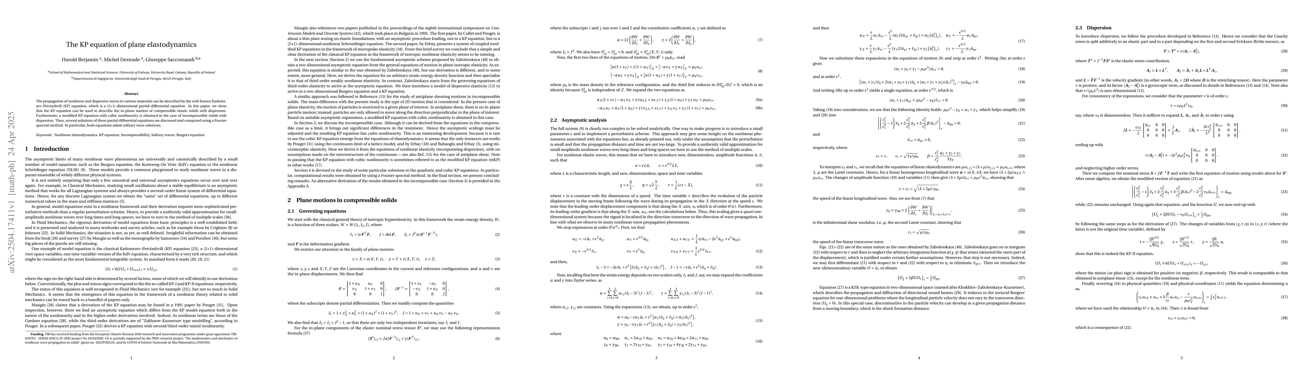 Researchers show that the Kadomtsev-Petviashvili equation can describe in-plane motion of compressible elastic solids with dispersion, and a modified equation for incompressible solids is also derived.