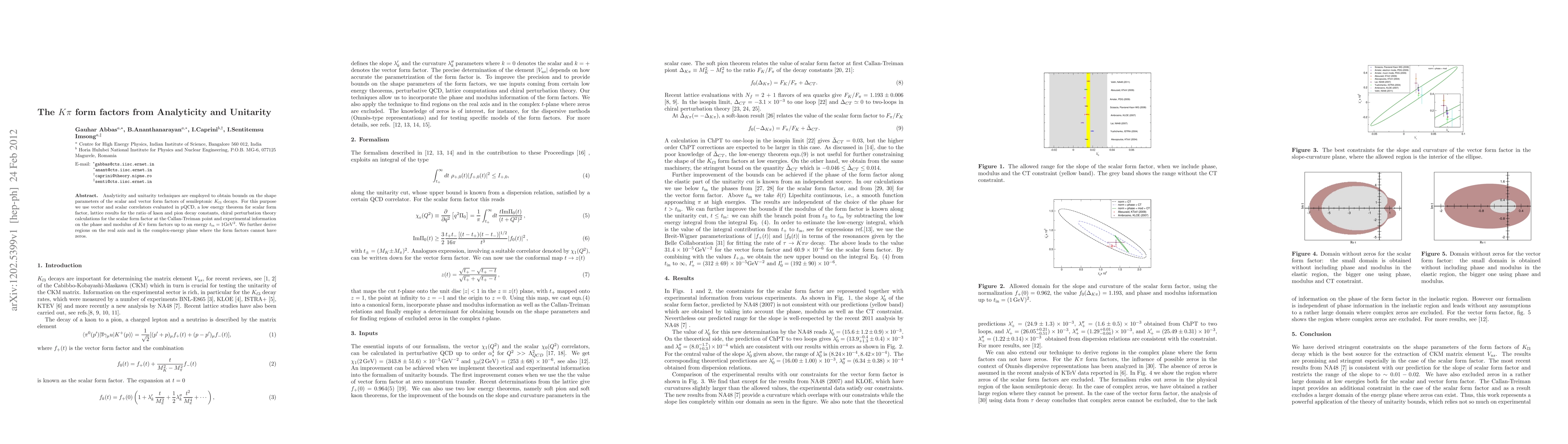 Analyticity and unitarity techniques are employed to obtain bounds on the shape parameters of the scalar and vector form factors of semileptonic $K_{l3}$ decays. For this purpose we use vector and scalar correlators evaluated in pQCD, a low energy theorem for scalar form factor, lattice results for the ratio of kaon and pion decay constants, chiral perturbation theory calculations for the scalar form factor at the Callan-Treiman point and experimental information on the phase and modulus of $K\pi $ form factors up to an energy $\tin=1 {\rm GeV}^2$. We further derive regions on the real axis and in the complex-energy plane where the form factors cannot have zeros.