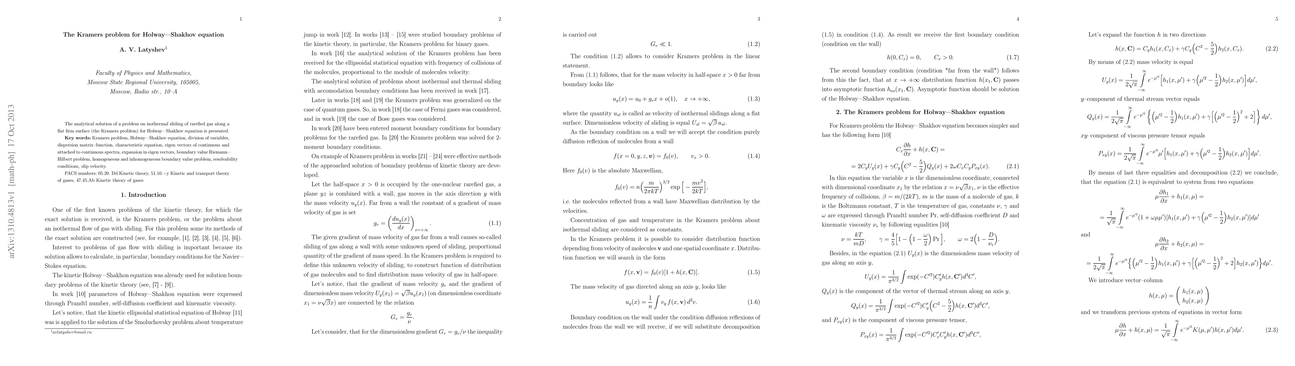 The analytical solution of a problem on isothermal sliding of rarefied gas along a flat firm surface (the Kramers problem) for Holway-Shakhov equation is presented.