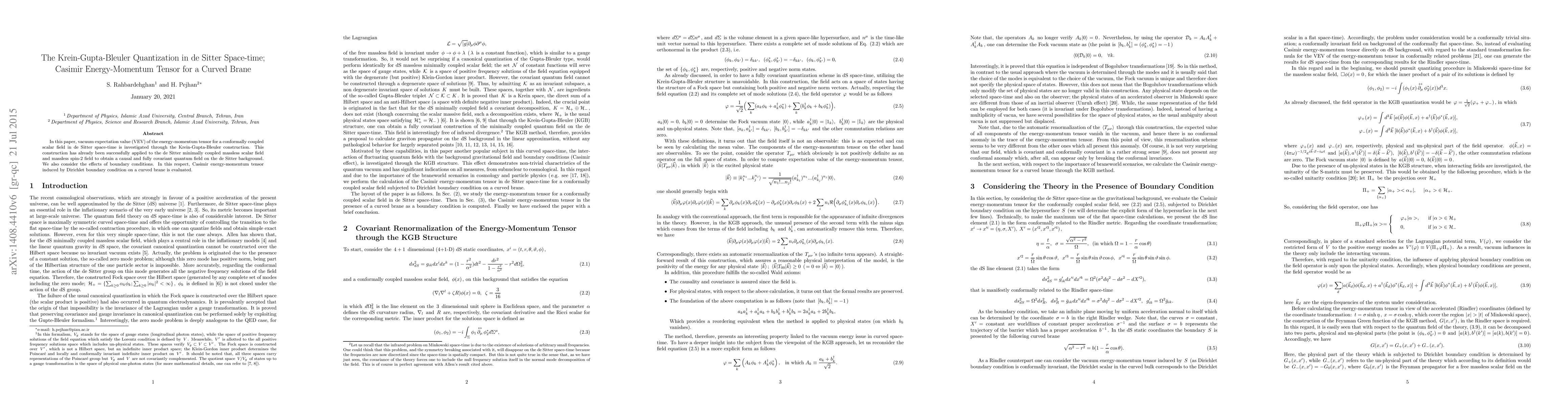 This paper investigates the vacuum expectation value of the energy-momentum tensor for a conformally coupled scalar field in de Sitter space-time using the Krein-Gupta-Bleuler quantization method. It also evaluates the Casimir energy-momentum tensor induced by Dirichlet boundary conditions on a curved brane.
