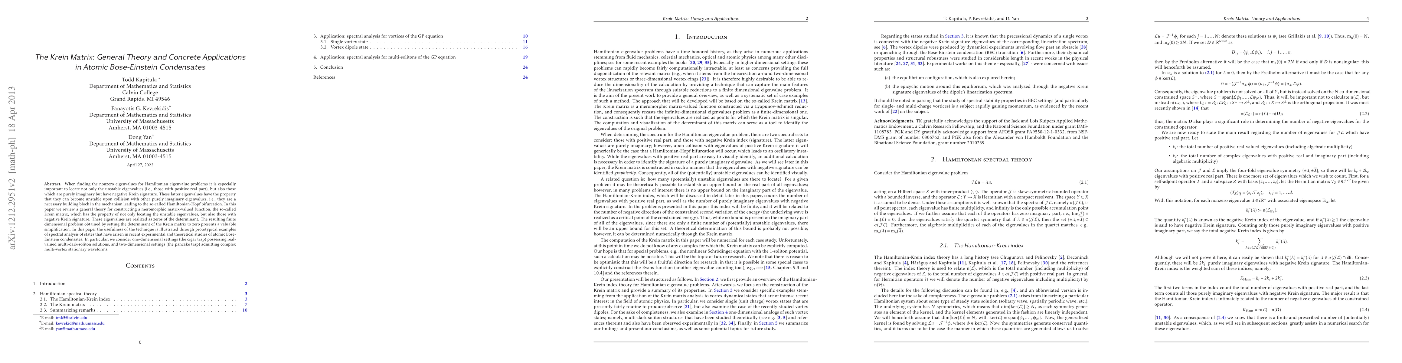 When finding the nonzero eigenvalues for Hamiltonian eigenvalue problems it is especially important to locate not only the unstable eigenvalues (i.e., those with positive real part), but also those which are purely imaginary but have negative Krein signature. These latter eigenvalues have the property that they can become unstable upon collision with other purely imaginary eigenvalues, i.e., they are a necessary building block in the mechanism leading to the so-called Hamiltonian-Hopf bifurcation. In this paper we review a general theory for constructing a meromorphic matrix-valued function, the so-called Krein matrix, which has the property of not only locating the unstable eigenvalues, but also those with negative Krein signature. These eigenvalues are realized as zeros of the determinant. The resulting finite dimensional problem obtained by setting the determinant of the Krein matrix to zero presents a valuable simplification. In this paper the usefulness of the technique is illustrated through prototypical examples of spectral analysis of states that have arisen in recent experimental and theoretical studies of atomic Bose-Einstein condensates. In particular, we consider one-dimensional settings (the cigar trap) possessing real-valued multi-dark-soliton solutions, and two-dimensional settings (the pancake trap) admitting complex multi-vortex stationary waveforms.