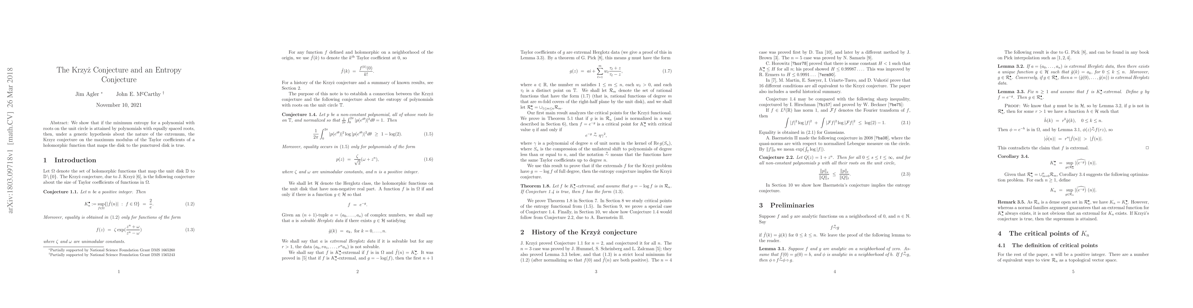 We show that if the minimum entropy for a polynomial with roots on the unit circle is attained by polynomials with equally spaced roots, then, under a generic hypothesis about the nature of the extremum, the Krzyz conjecture on the maximum modulus of the Taylor coefficients of a holomorphic function that maps the disk to the punctured disk is true.
