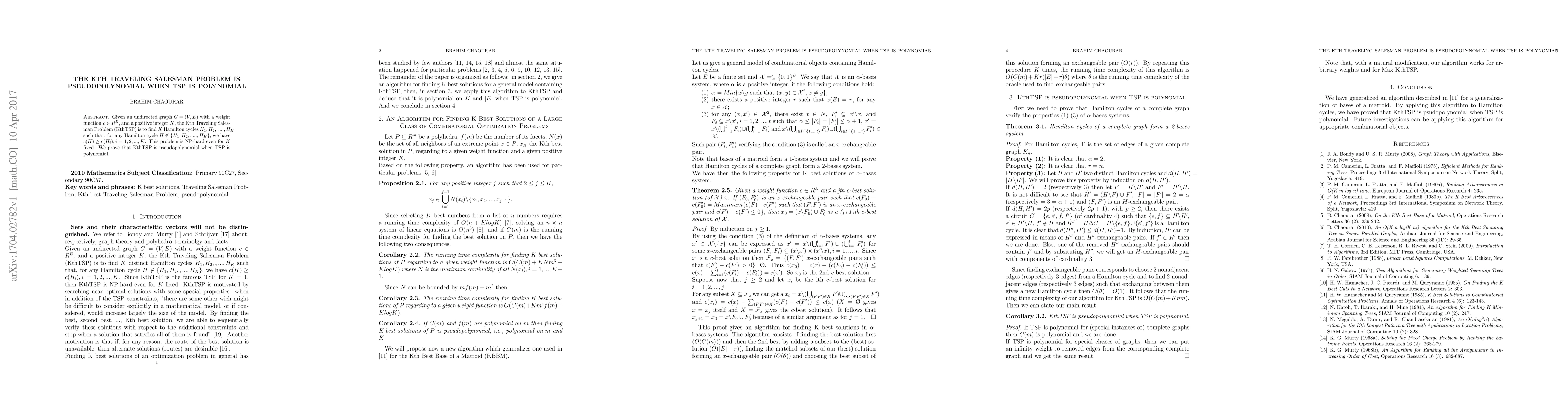 Given an undirected graph $G=(V, E)$ with a weight function $c\in R^E$, and a positive integer $K$, the Kth Traveling Salesman Problem (KthTSP) is to find $K$ Hamilton cycles $H_1, H_2, , ..., H_K$ such that, for any Hamilton cycle $H\not \in \{H_1, H_2, , ..., H_K \}$, we have $c(H)\geq c(H_i), i=1, 2, ..., K$. This problem is NP-hard even for $K$ fixed. We prove that KthTSP is pseudopolynomial when TSP is polynomial.