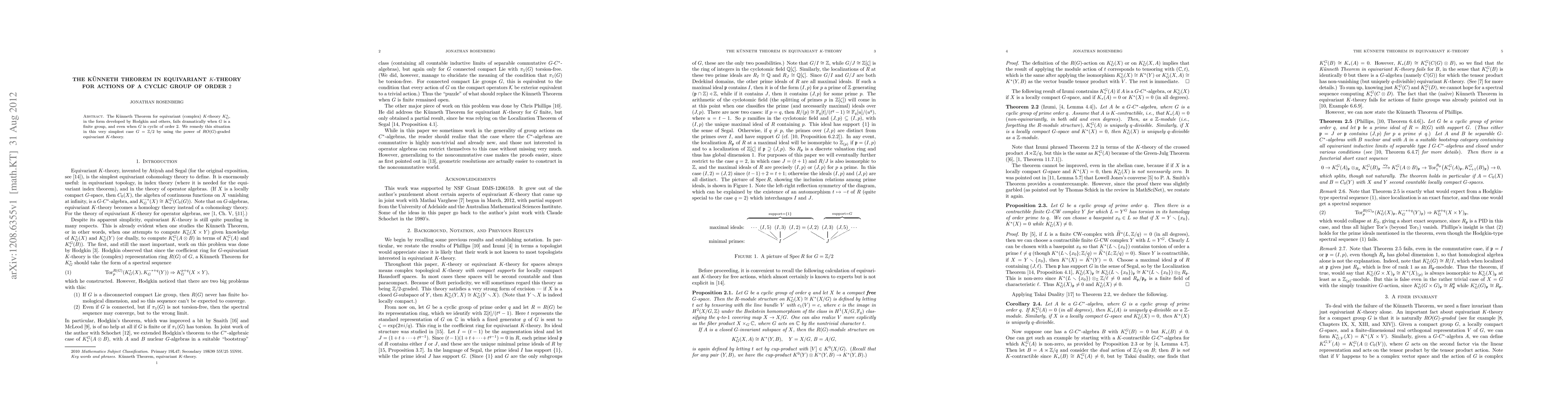 Summary: This paper addresses the failure of the K\"unneth Theorem in equivariant K-theory for cyclic groups of order 2, proposing a solution using RO(G)-graded equivariant K-theory to successfully apply the theorem in this specific case.