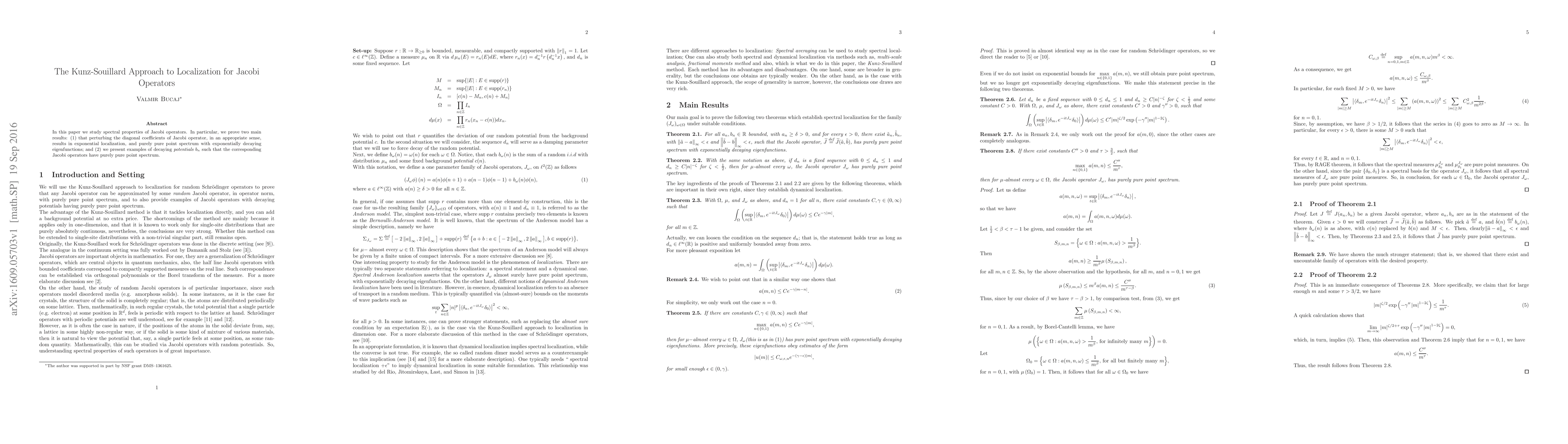Researchers prove that perturbing Jacobi operators with decaying potentials leads to exponential localization of eigenfunctions and a purely pure point spectrum.