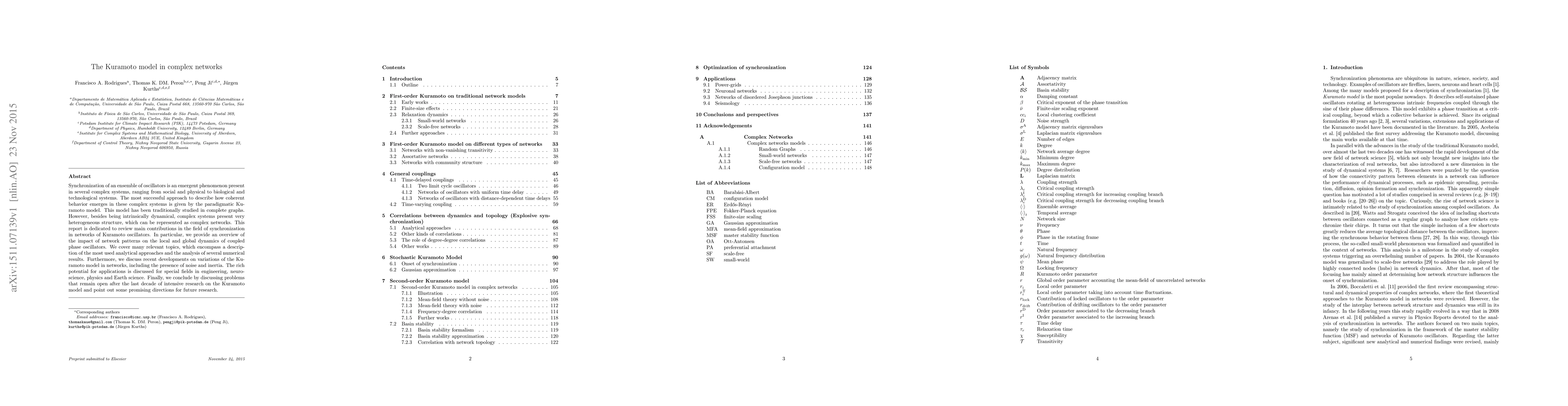 This paper reviews the synchronization phenomena in complex networks using the Kuramoto model, focusing on how network structures influence local and global dynamics. It discusses analytical approaches, numerical results, and recent developments, including noise and inertia variations, and highlights applications in engineering, neuroscience, physics, and Earth science, while identifying open problems and future research directions.