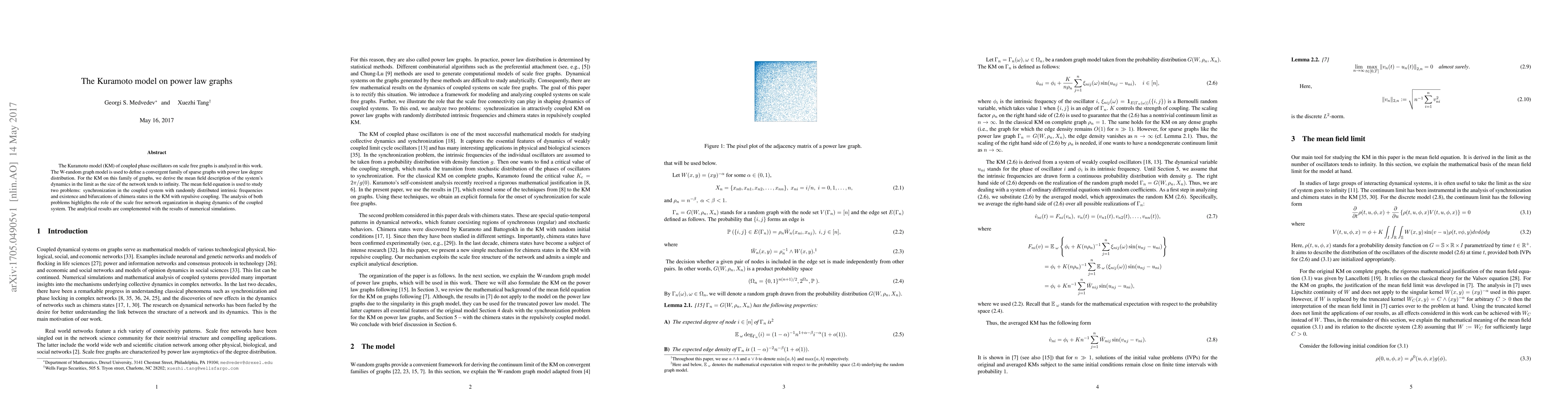 The Kuramoto model on power law graphs is analyzed for its synchronization dynamics and existence of chimera states, highlighting the role of scale-free network organization in shaping system behavior.