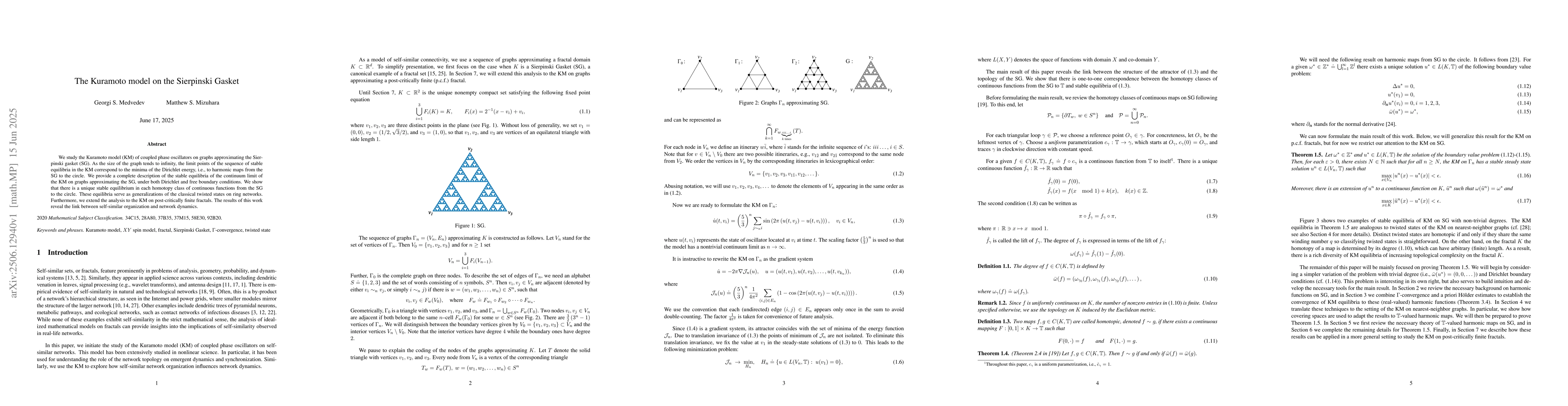 We study the Kuramoto model (KM) of coupled phase oscillators on graphs approximating the Sierpinski gasket (SG). As the size of the graph tends to infinity, the limit points of the sequence of stable equilibria in the KM correspond to the minima of the Dirichlet energy, i.e., to harmonic maps from the SG to the circle. We provide a complete description of the stable equilibria of the continuum limit of the KM on graphs approximating the SG, under both Dirichlet and free boundary conditions. We show that there is a unique stable equilibrium in each homotopy class of continuous functions from the SG to the circle. These equilibria serve as generalizations of the classical twisted states on ring networks. Furthermore, we extend the analysis to the KM on post-critically finite fractals. The results of this work reveal the link between self-similar organization and network dynamics.