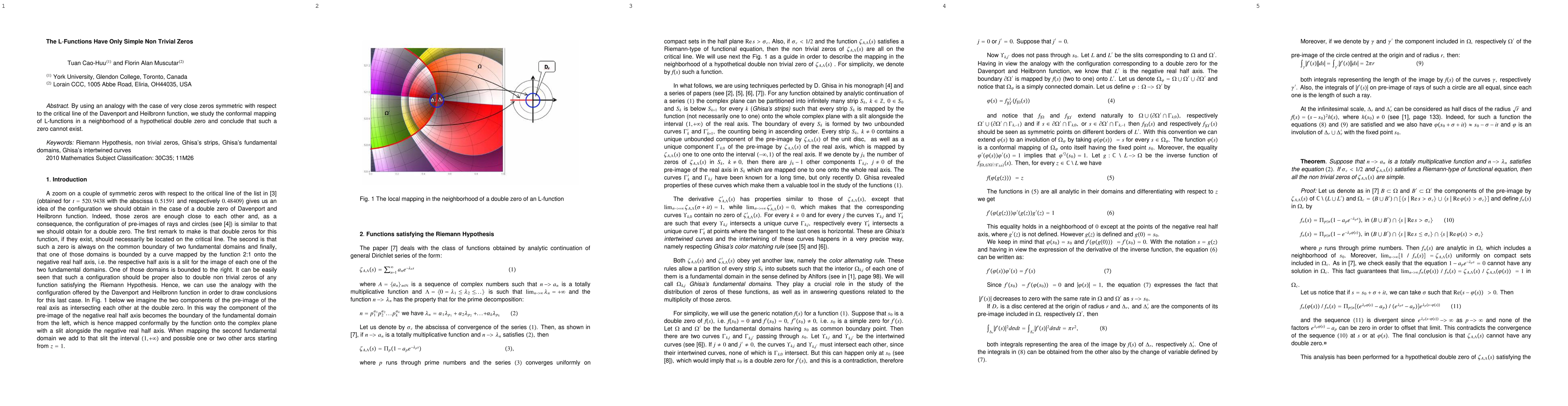 By using an analogy with the case of very close zeros symmetric with respect to the critical line of the Davenport and Heilbronn function, we study the conformal mapping of L-functions in a neighborhood of a hypothetical double zero and conclude that such a zero cannot exist. Keywords: Riemann Hypothesis, non trivial zeros, Ghisa's strips, Ghisa's fundamental domains, Ghisa's intertwined curves 2010 Mathematics Subject Classification: 30C35; 11M26