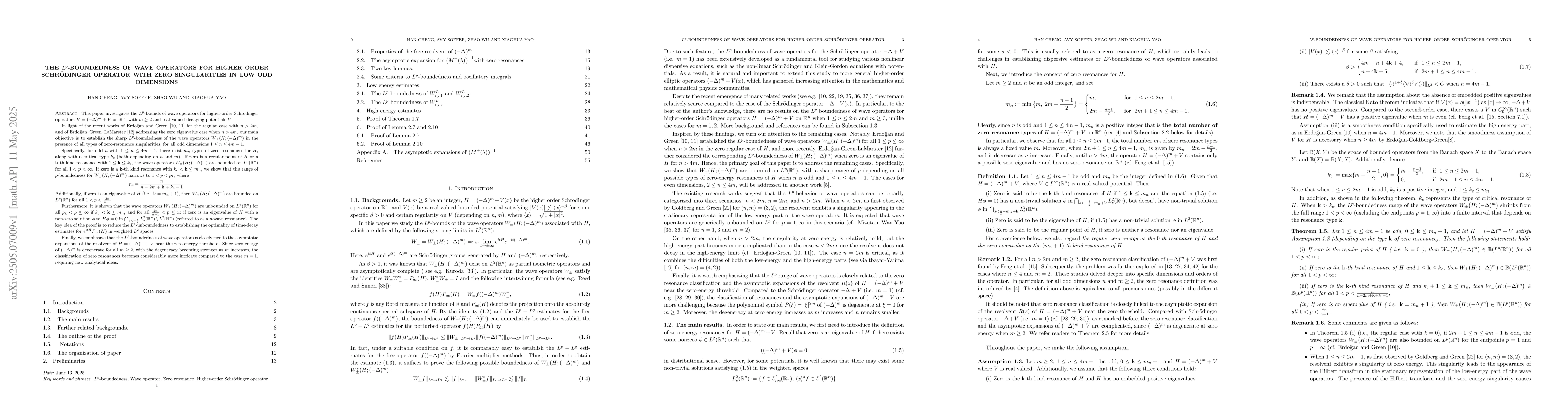 The paper employs techniques from spectral theory, harmonic analysis, and time-decay estimates to analyze wave operators for higher-order Schrödinger operators with singularities.