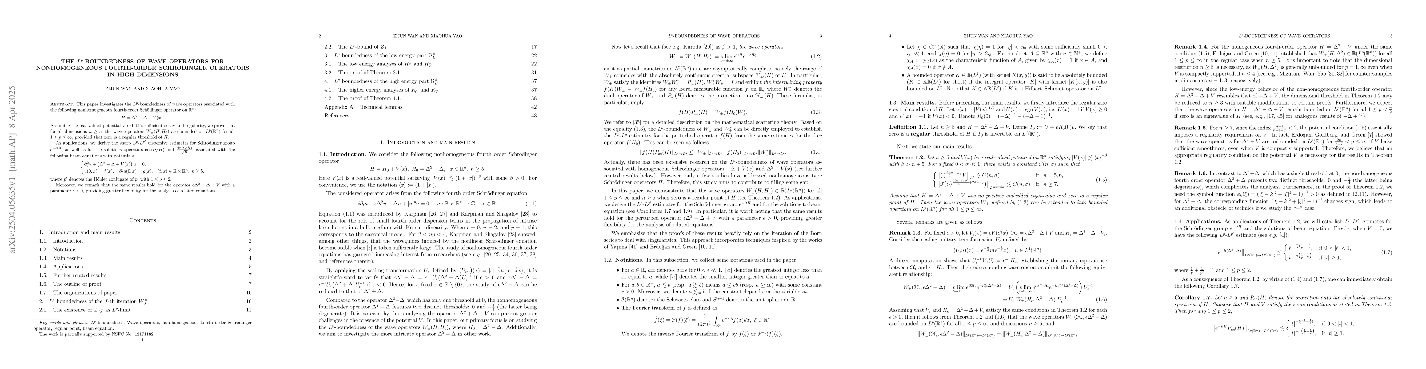 The paper establishes $L^p$-boundedness of wave operators and derives sharp dispersive estimates for high-dimensional nonhomogeneous fourth-order Schrödinger operators with non-constant potentials, extending previous work to a more general class of operators.