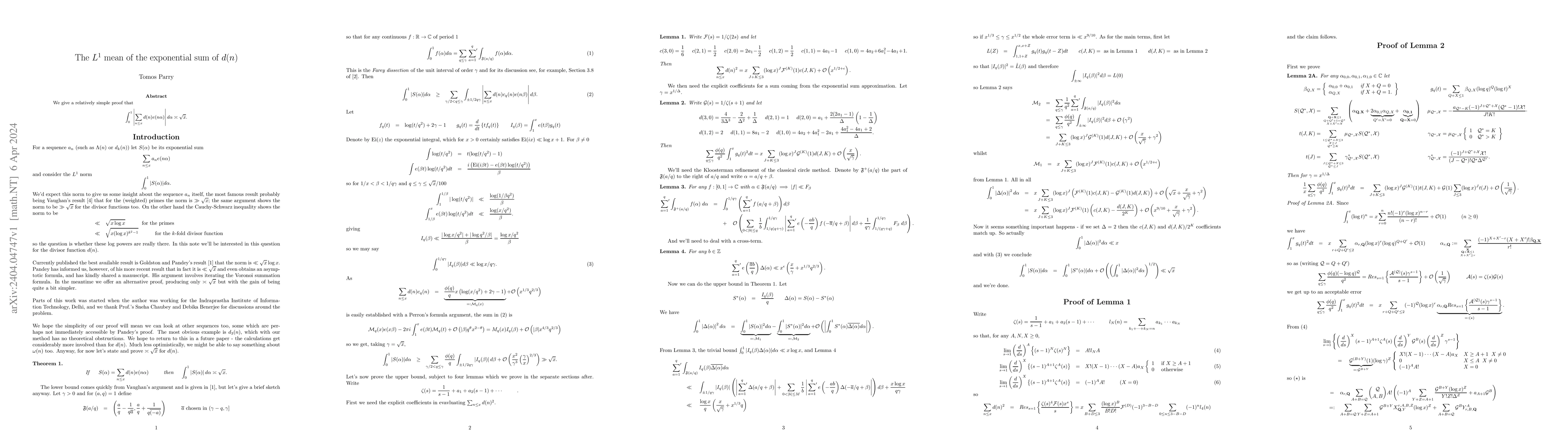 We give a relatively simple proof that \[ \int _0^1\left |\sum _{n\leq x}d(n)e(n\alpha )\right |d\alpha \asymp \sqrt x.\]