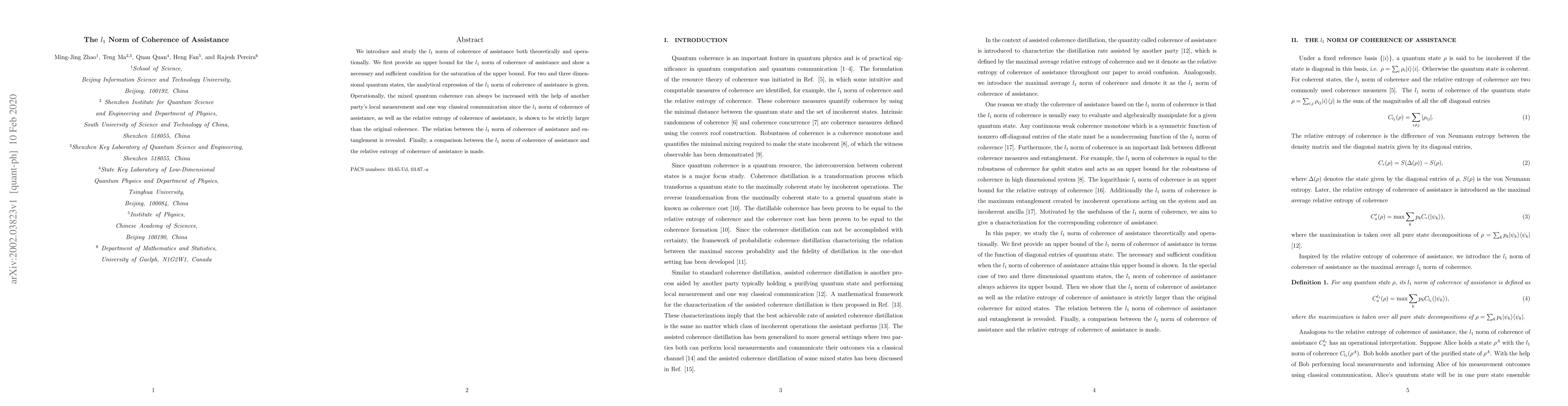 This paper introduces and analyzes the l1 norm of coherence of assistance in quantum states, providing an upper bound and conditions for its saturation. It demonstrates that mixed quantum coherence can be enhanced through local measurement and classical communication, and explores its relationship with entanglement and comparison with the relative entropy of coherence of assistance.