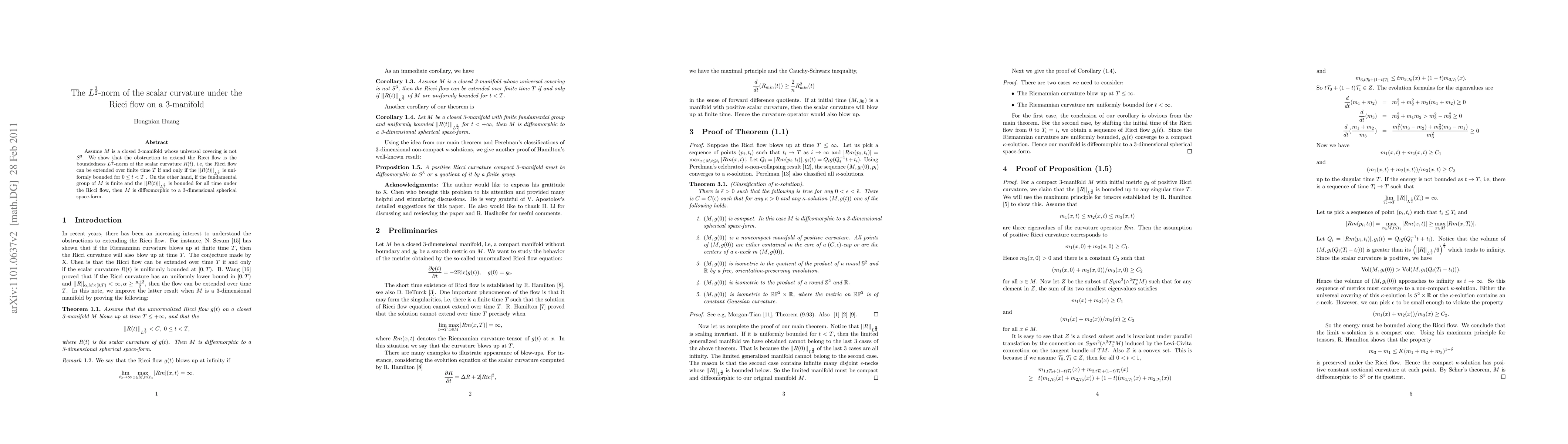 Assume $M$ is a closed 3-manifold whose universal covering is not $S^3$. We show that the obstruction to extend the Ricci flow is the boundedness $L^{3/2}$-norm of the scalar curvature $R(t)$, i.e, the Ricci flow can be extended over time $T$ if and only if the $||R(t)||_{L^{3/2}}$ is uniformly bounded for $0 \leq t < T$ . On the other hand, if the fundamental group of $M$ is finite and the $||R(t)||_{L^{\3/2}}$ is bounded for all time under the Ricci flow, then $M$ is diffeomorphic to a 3-dimensional spherical space-form.